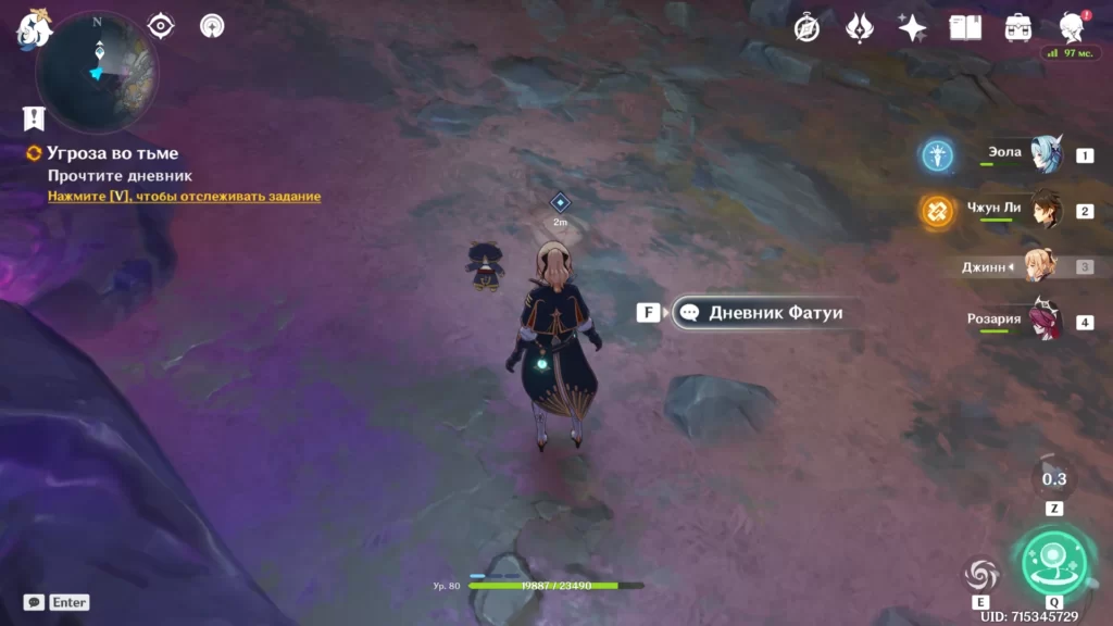 Спускаемся в образовавшийся проход. На земле возле черного тумана находим дневник фатуи, он содержит нужную нам информацию.