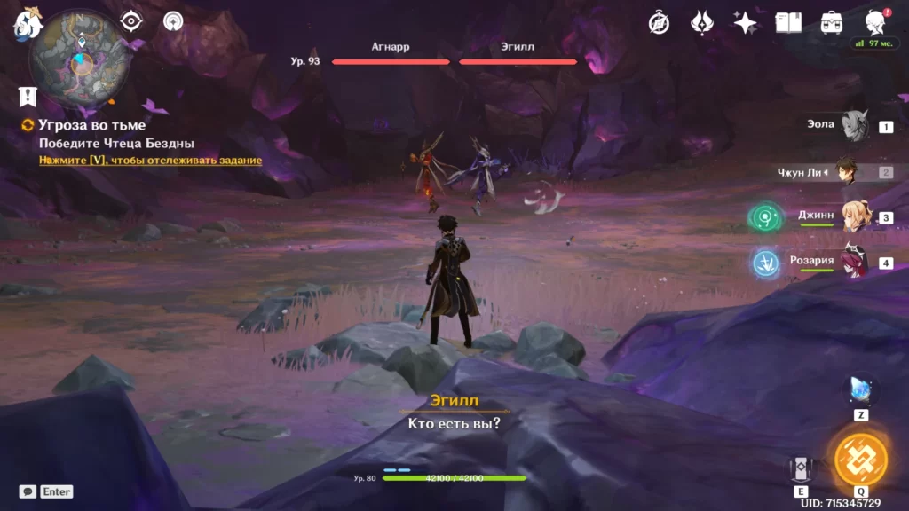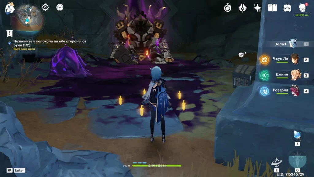 После победы подходим к колоколу и звоним. Возвращаемся к черному туману, из него выйдут два чтеца бездны (пиро и электро), убиваем их.