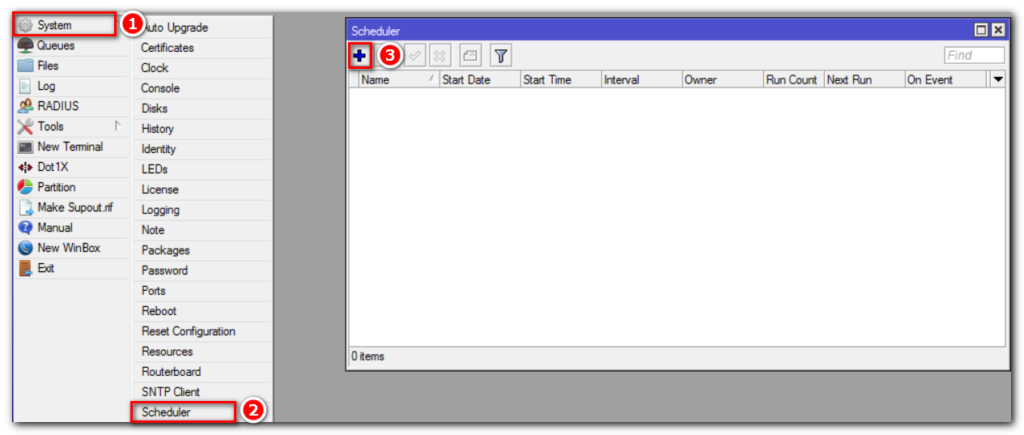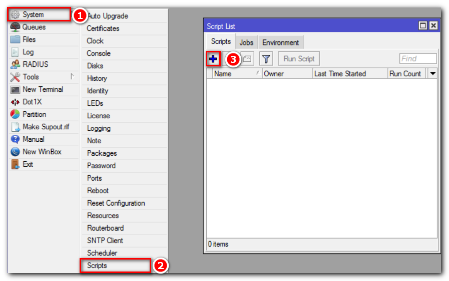 Создадим скрипт, который будет выполнять бэкап полной конфигурации системы двумя способами (backup, export). Отправлять его на электронную почту и удалять с маршрутизатора.