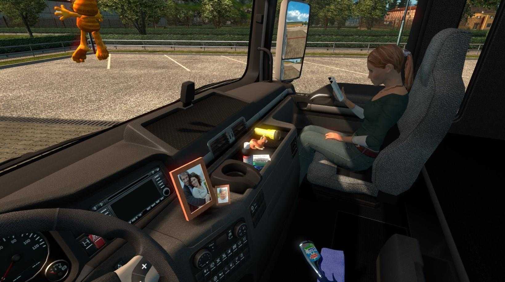 Если вы решили превратить вашу кабину в «бордель» (это слово применяет сам автор в описании солнцезащитных шторок, мы всего лишь переставили его в начало, прим. ТракСим), то без этого мода вам играть нельзя! Мод добавляет к стандартному набору DLC Cabin Accessories большое количество слотов для установки предметов и широкий выбор таковых: 30 флажков, 30 вымпелов, большое количество 3D-объектов, всякие висюльки, шторки с рюшечками и прочее барахло. Всё это колышется, развивается, шевелится. «Это просто, праздник какой-то» (если кто помнит слова Карабаса-Барабаса из музыкального к/ф «Приключения Буратино»). Дорогу, правда, видно… не очень. Так, чего мы на дороге не видели-то?