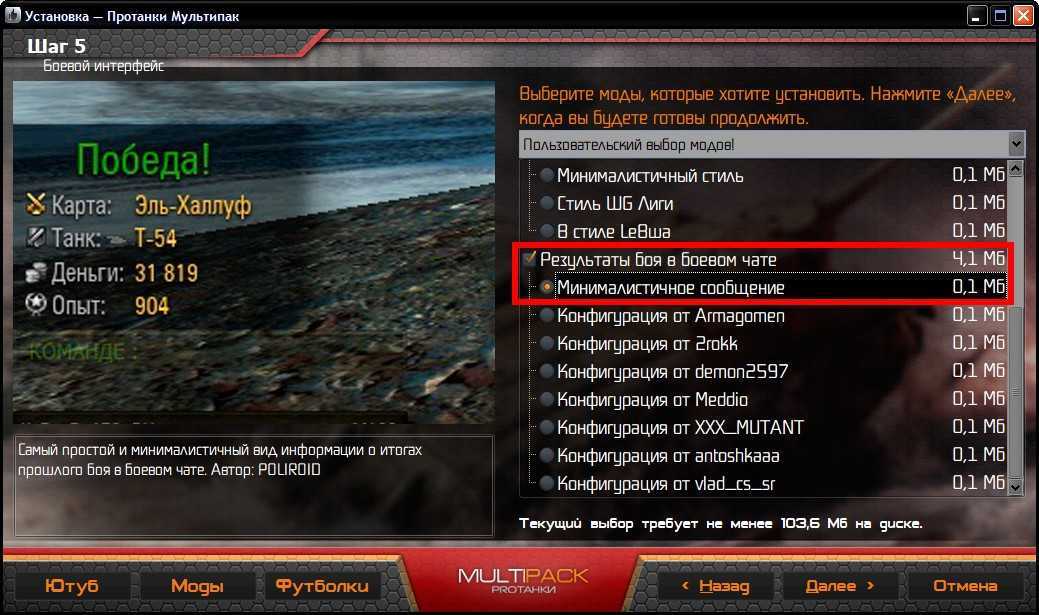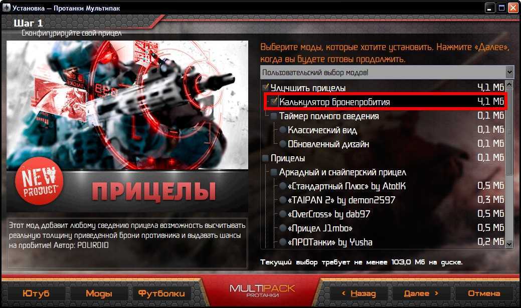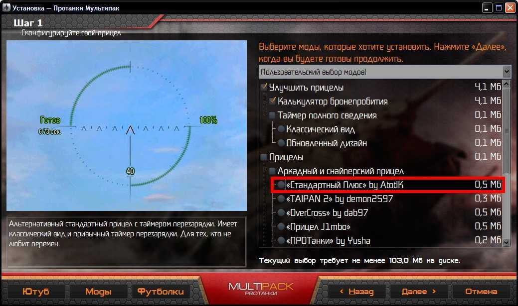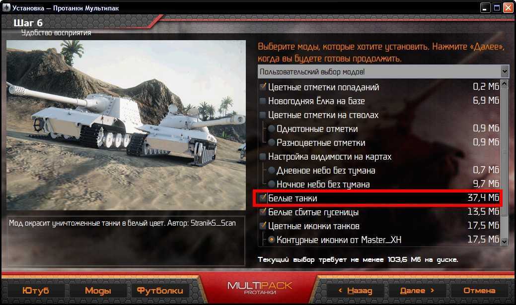 Как и у предыдущего модпака, установка здесь очень простая: запустить инсталлятор, выбрать нужные модификации и все готово. В сборку вошли лучшие моды для World of Tanks на любой вкус: прицелы разных видов, белые сбитые гусеницы, менеджер реплеев, цветные отметки на стволах, горизонтальное дерево исследований, счетчик вытанкованного урона и еще очень много всего. Полный список модификаций можно посмотреть на сайте ProTanki в соответствующем разделе.