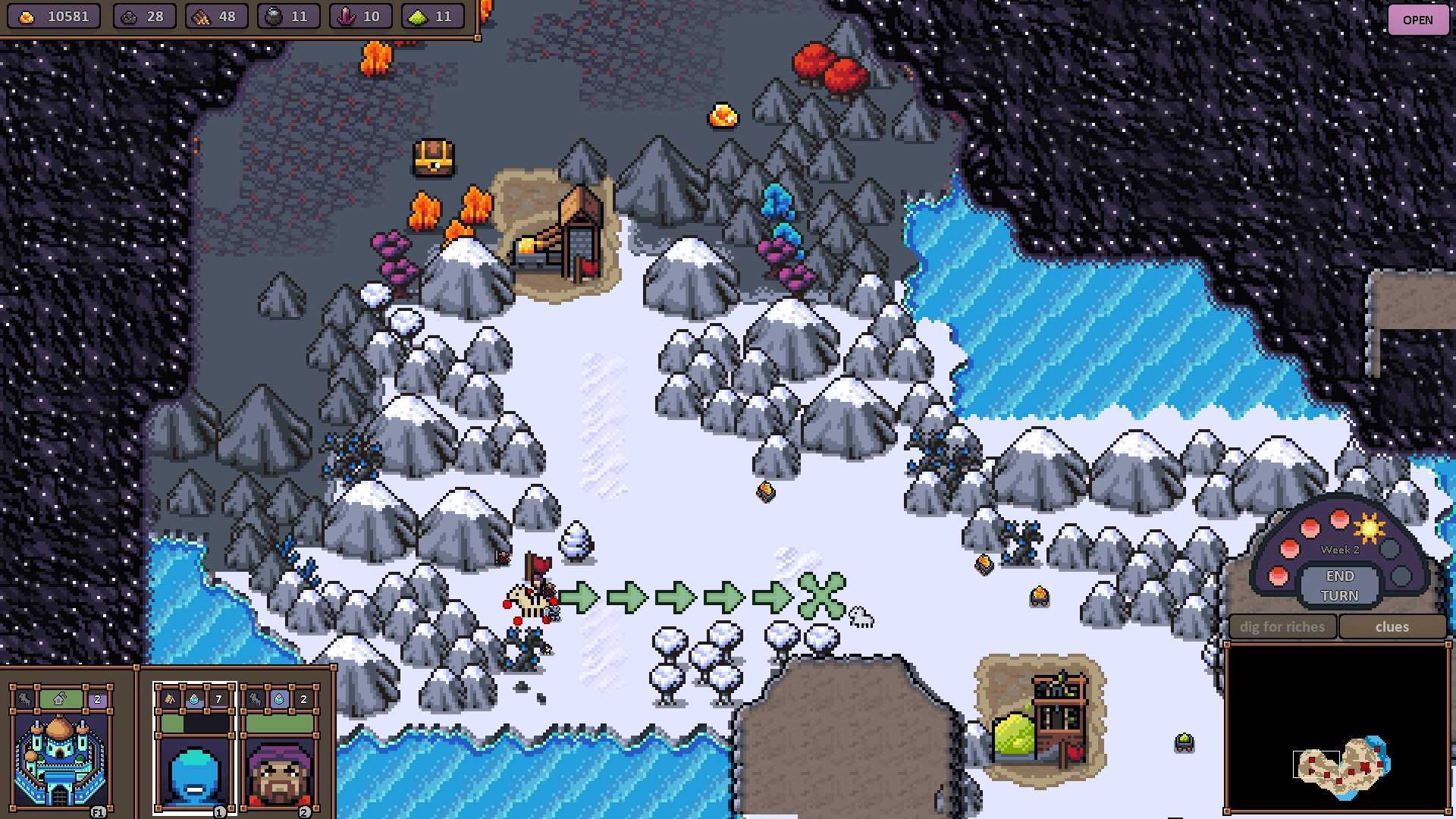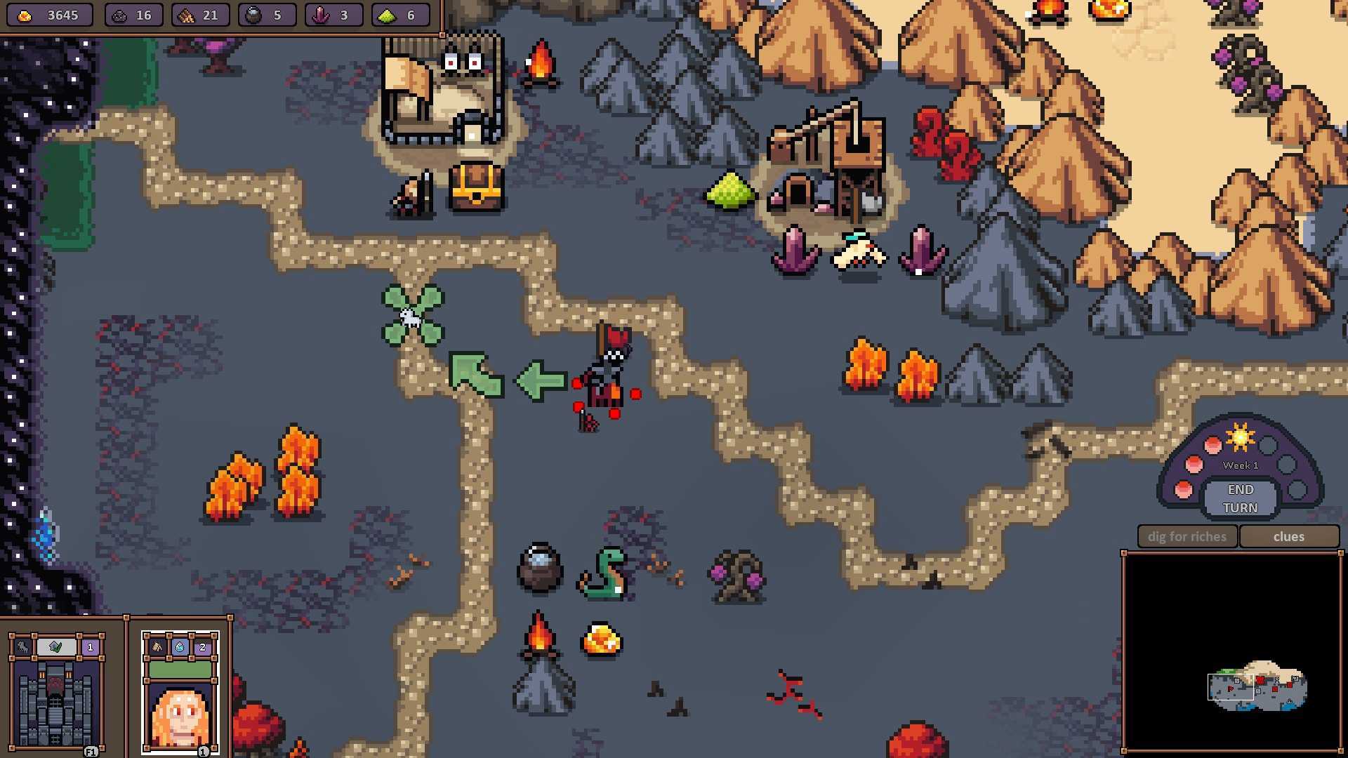Ну то есть как, по моему скромному мнению, местный пиксель-арт ничего особо интересного из себя не представляет, он строго утилитарен. Надо, чтобы игрок понимал, где что в игре находится, с этой задачей графика справляется. Общая картинка весьма органична: приятные глазу горы и деревья, вполне узнаваемые лесопилки, шахты и другие постройки с ресурсами, игрушечная лошадка героя и хорошо различимые даже в общей свалке юниты – все элементы сочетаются вместе и выполняют свою функцию как надо. Но вот ничего интересного в местном дизайне нет.