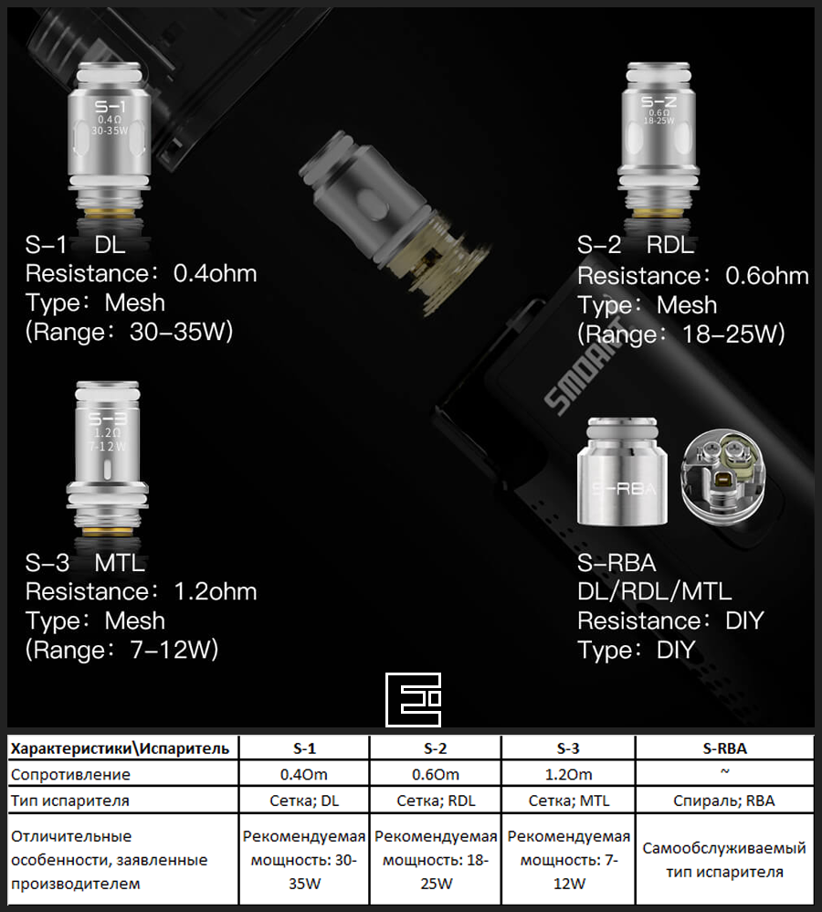 Стандартным испарителем считается S-2 RDL в 0.6 Om. Он имеет средние характеристики, и он же поставляется в базовой комплектации вместе с устройством. Но он ли лучший? Отнюдь. Всё зависит от ваших вкусовых предпочтений. Поскольку стоимость у трёх основных испарителей держится в одном диапазоне, я настоятельно советую попробовать каждый из них — так вы сможете выбрать именно тот испаритель, который будите покупать на постоянной основе.