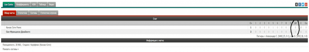 Пример (если заполнена графа ДИ – то был экстра иннинг, то есть дополнительный иннинг после ничьей)
