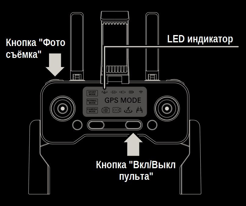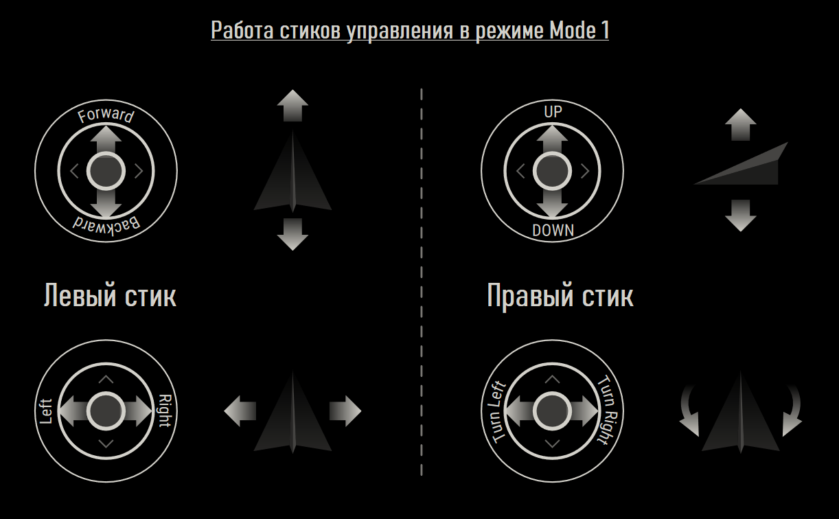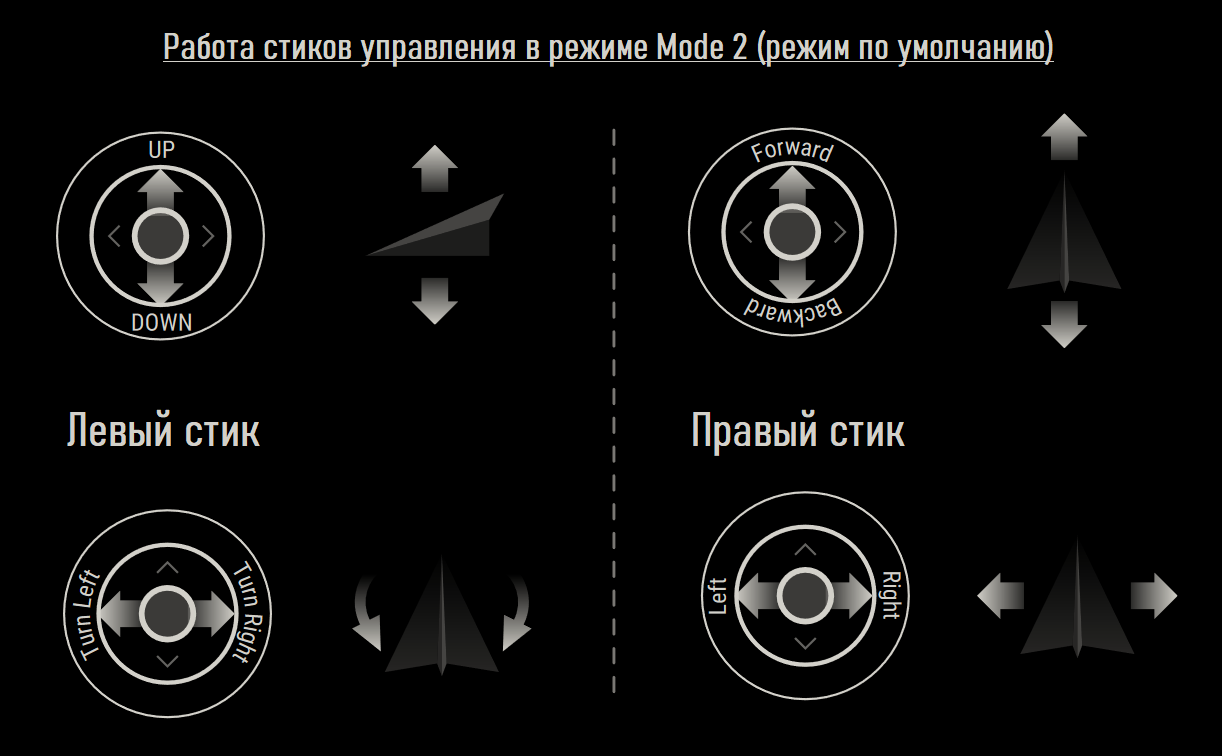 Пульт управления может работать в режиме Mode 1 или Mode 2 (установлен по умолчанию; левый стик отвечает за взлёт/снижение/вращение дрона вокруг своей оси влево и вправо, правый за полёт вперёд/назад/влево/вправо). Данная опция стандартна для всех беспилотников и подразумевает условную смену стиков местами. Это сделано специально для правшей и левшей. Например, при переключении пульта в режим работы стиков Mode 1, стик отвечающий за взлёт и снижение будет справа, а стик отвечающий за полёт вперёд/назад/влево/вправо — слева. Если пользователь правша, то менять ничего не надо, так как Mode 2 установлен по умолчанию, если левша, то необходимо проделать следующие действия: