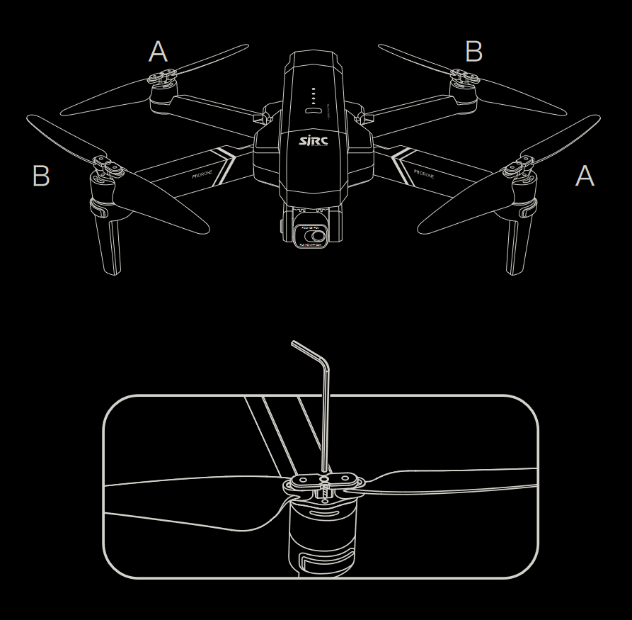 При установке/замене пропеллеров необходимо обратить внимание на напечатанные на каждом пропеллере буквенные обозначения «A» или «B», которые в свою очередь должны совпасть с теми же буквенными обозначениями на лучах (опоры на которых установлены моторы) дрона. Для монтажа пропеллеров используйте идущий в комплекте ключ