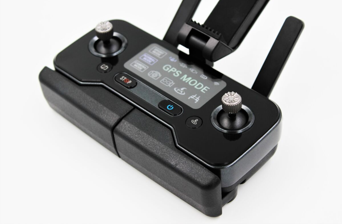 В комплекте с дроном идёт портативная аппаратура управления. Согласно заявленной спецификации работает в диапазоне частот 2.4ГГц. Обеспечивает передачу сигнала на расстояние до 1500 метров. Питание пульта встроенное: 1S 3.7В 300 мАч LiPo. Обеспечивает макс. время работы на одном заряде около 11 часов. В центре пульта располагается дисплей, который реализован посредством светодиодной индикации отражающей текущее состояние ряда систем/функций дрона.