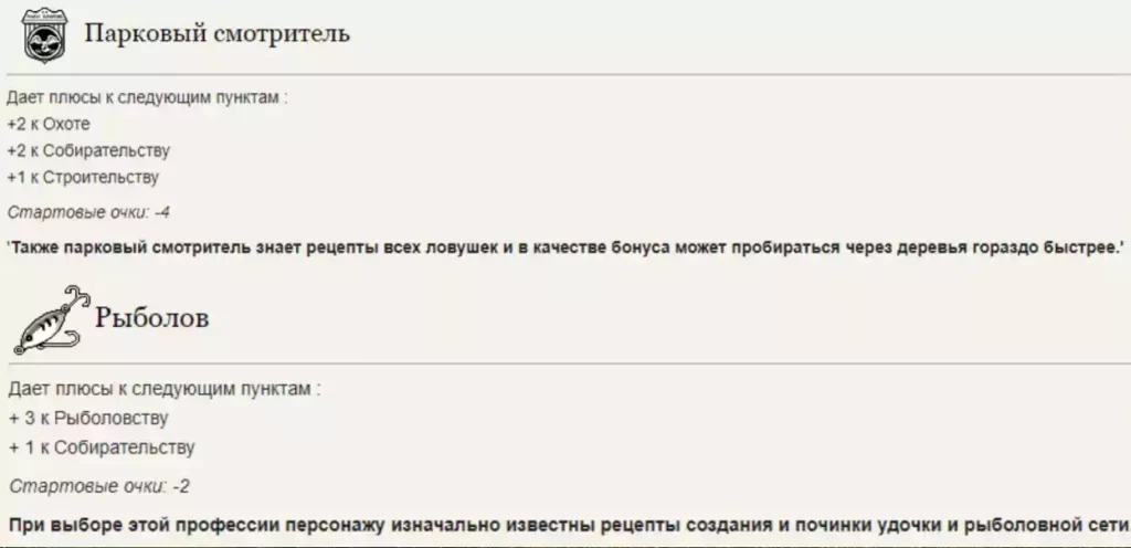 Профессия Парковый смотритель дает на старте +2 уровня собирательства, профессия Рыболов добавит +1 уровень собирательства.
