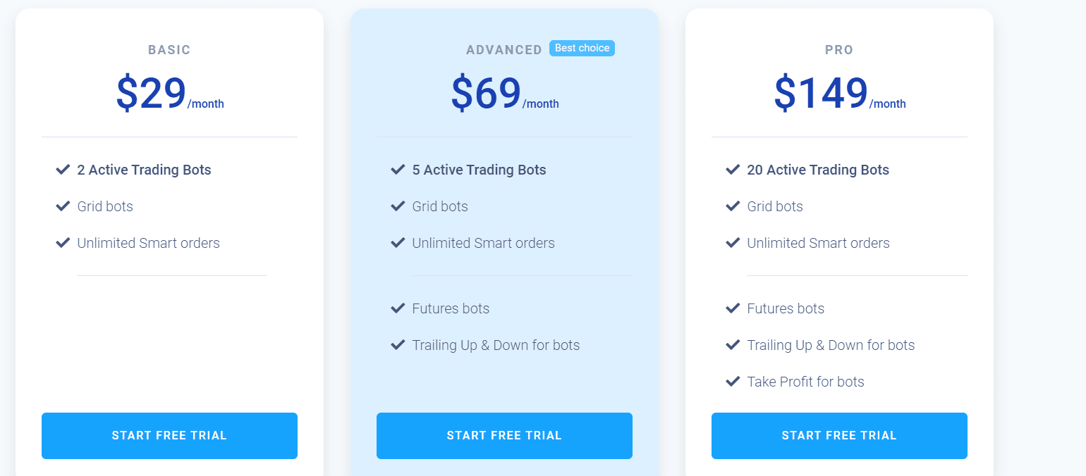 С месячным торговым лимитом в 100,000 12 долларов расширенный счет предлагает арбитражную торговлю, пять активных торговых ботов и будущих ботов. Вы можете сэкономить 6 долларов в месяц, оформив подписку на XNUMX месяцев.