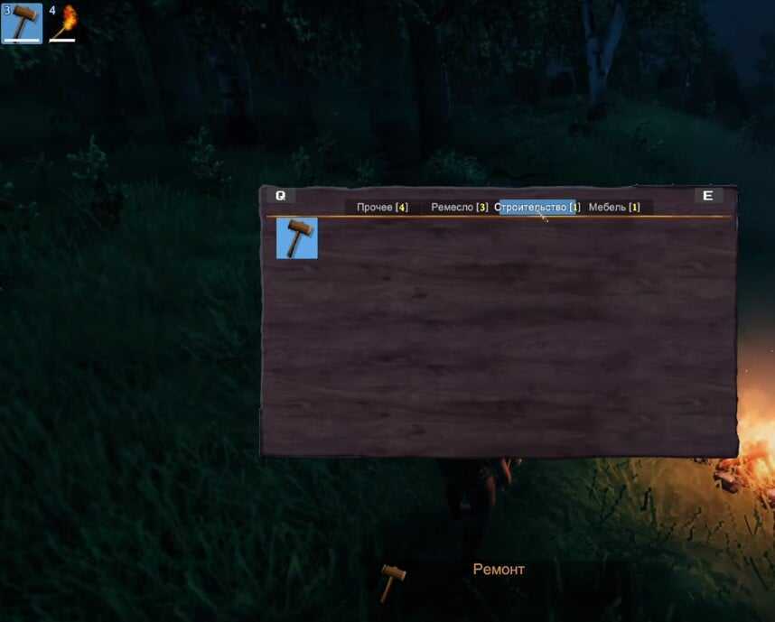 Строительство открывается сразу после создания молота. Теперь достаточно взять молот в руки и нажать ПКМ – откроется меню строительства.