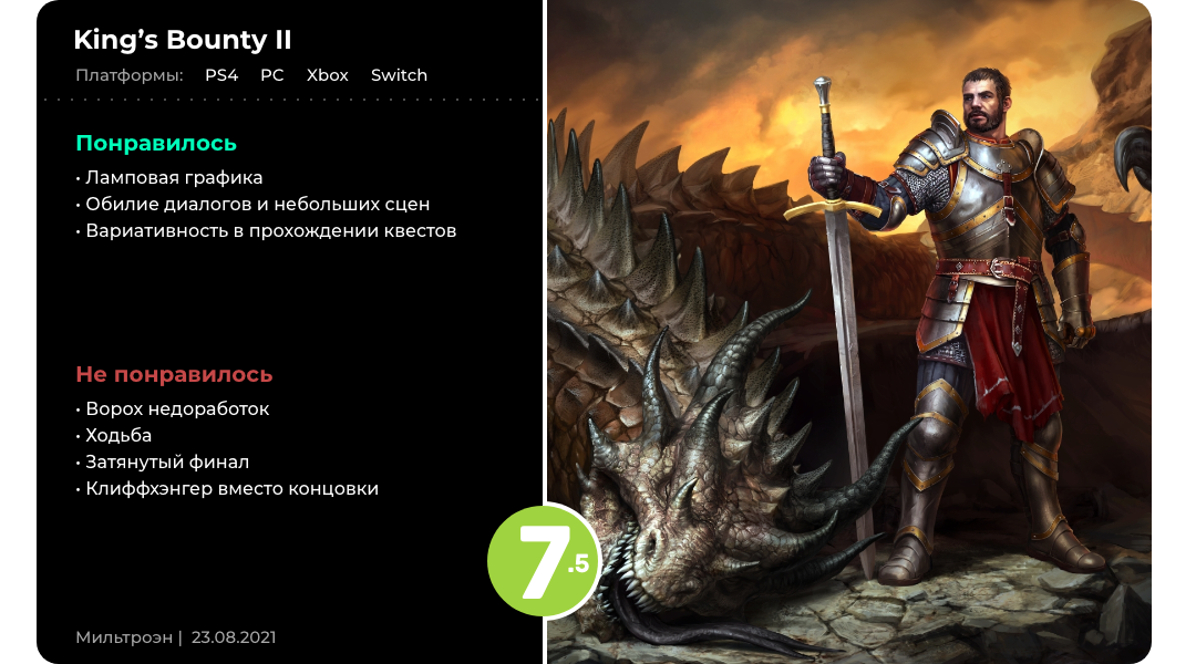 Самое сложное с Kings Bounty II — это поставить ей адекватную оценку. Умом я понимаю, что практически все вещи, испортившие мне впечатление от игры, могут и со временем обязательно будут исправлены. Но это в будущем, а сейчас мы имеем на руках неплохую RPG с приятной, хоть и устаревшей картинкой, которая может вывести из себя даже познавшего дзен буддиста.
