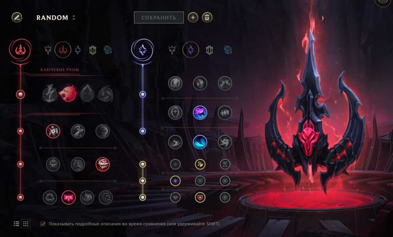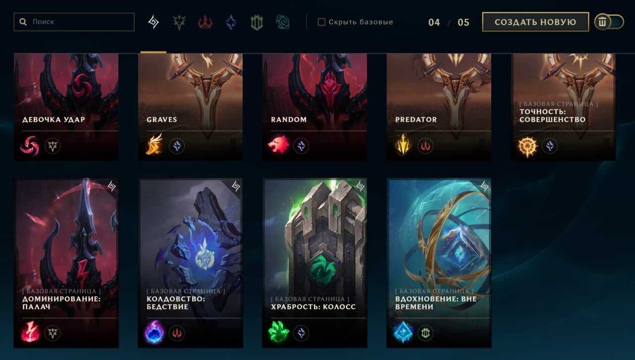 Гайд LoL был бы не полным, если бы здесь не было информации про руны. Они выбираются внизу экрана во время выбора чемпиона. Существует 5 базовых рун и 5 дополнительных на их же основе: точность, колдовство, доминация, храбрость и вдохновение. В каждой руне есть 3-4 эффекта 5 уровней, на дополнительной руне их по 3 на 3 уровня.