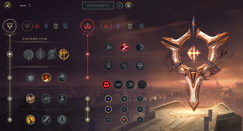Во второй строке можно взять любую из трех рун — поэкспериментируйте и подберите самую подходящую для себя. На третьей и четвертой все понятно: «Рвение» для улучшения скорости атаки и «Удар милосердия», чтобы ни один негодяй не сбежал.
