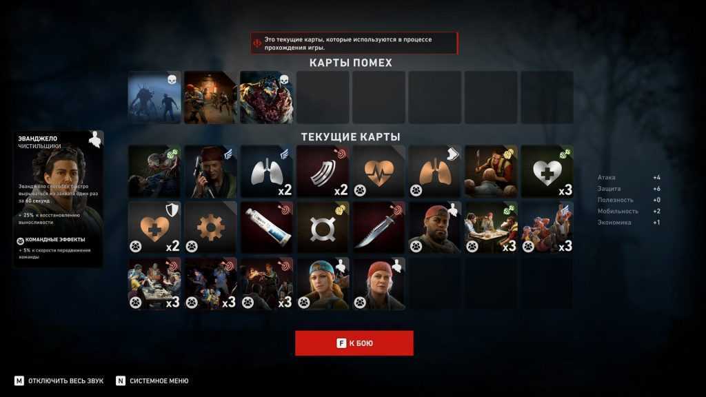 А ведь это одна из ключевых механик игры. Перед очередной вылазкой можно залезть в меню и составить колоду. На каждом уровне кампании мы будем вытаскивать из нее одну карту. Сами карточки — это баффы. Большая их часть — элементарные улучшения, повышающие здоровье или выносливость команды, но бывают и штуки посерьезнее, например, карта, заменяющая удар кулаком на смертельный для рядовых зомби тычок ножом. По замыслу разработчиков, игроки должны чахнуть над этими колодами, скрупулезно собирая целые билды. И это идет вразрез со словом «фан», если мы говорим о веселом и мясном кооп-шутере. Механика-то рабочая, но она явно ошиблась игрой.