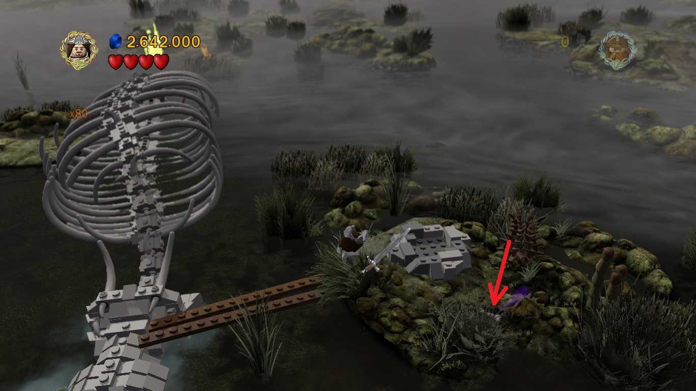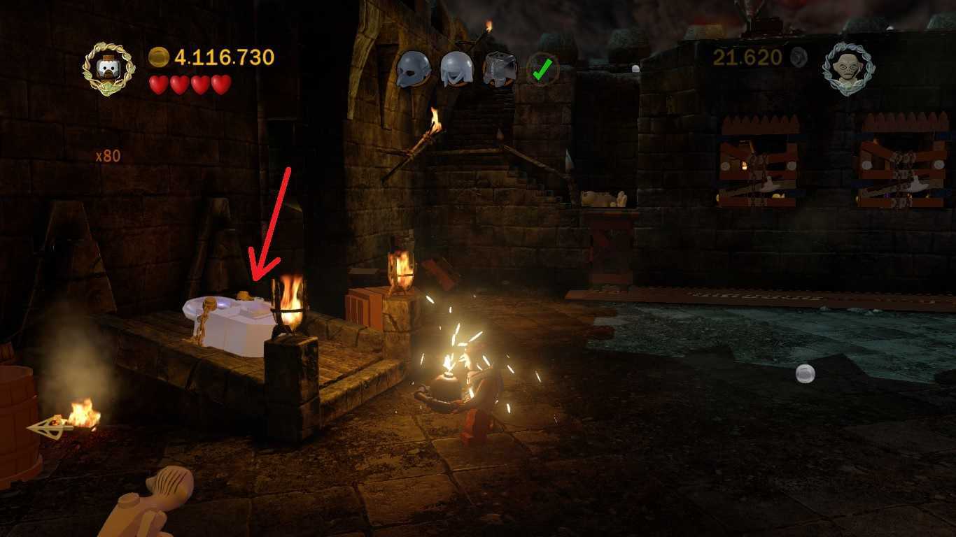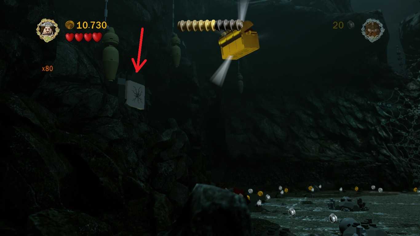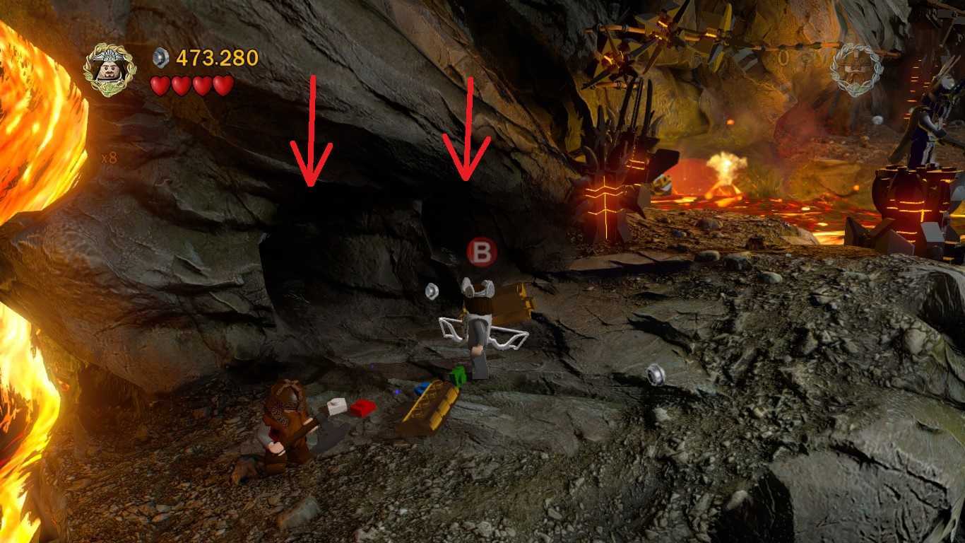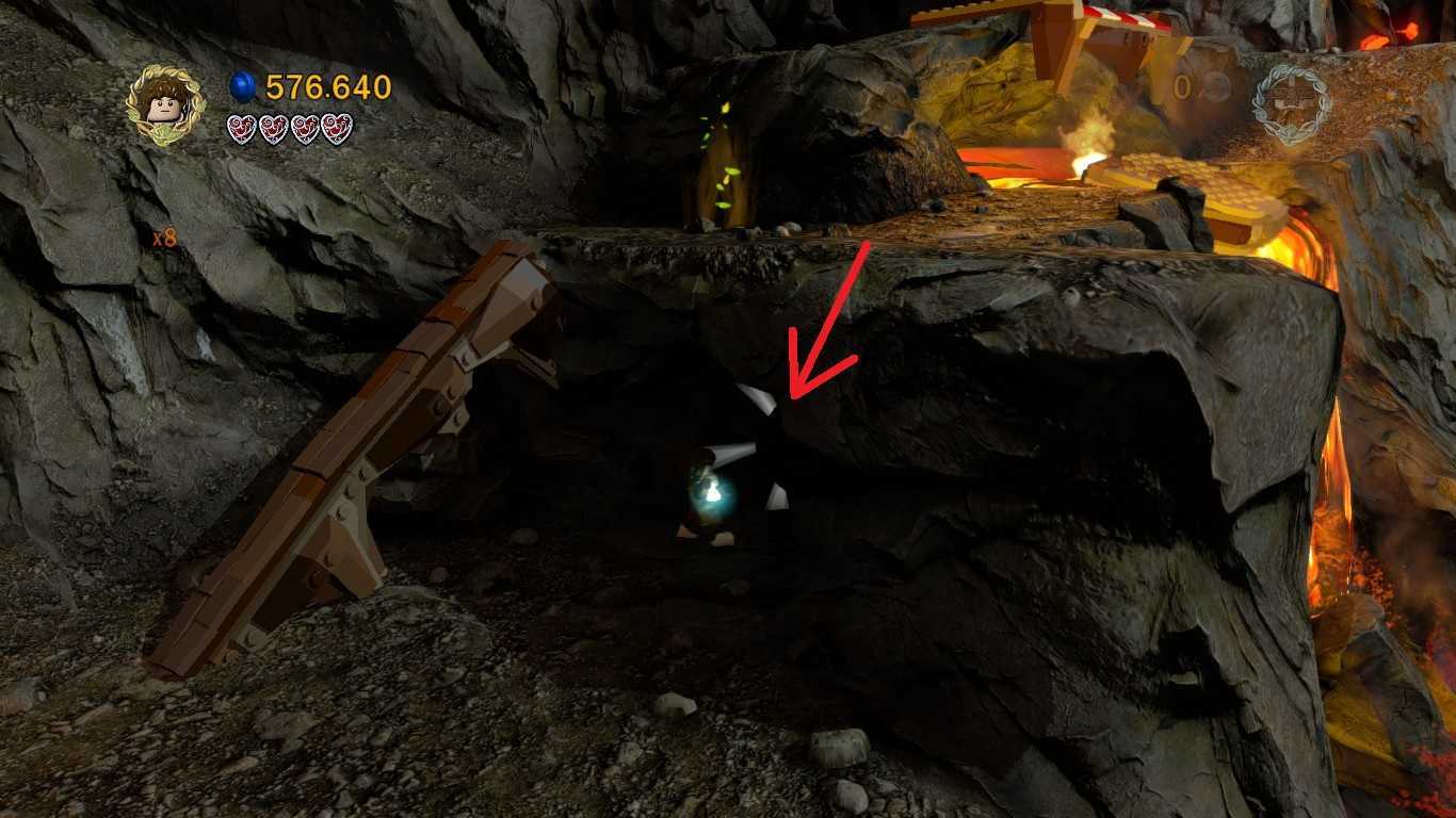 Справа на стене разлом, который может разбить Гимли. Бросаем его и попадаем в секретную локацию. При помощи мифрильной веревки или, опять же, Сэма, забираемся на площадку, причем обоими персонажами. Снова бросаем Гимли, затем переключаемся на Голума и забираемся еще выше. Дальше при помощи меча Арагорна (или Элендила, кому как больше нравится) разбиваем моргульские блоки. Хлынет поток лавы, который вынесет третий мини-кит в бассейн.