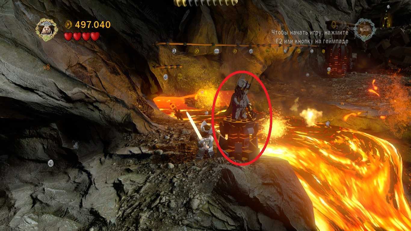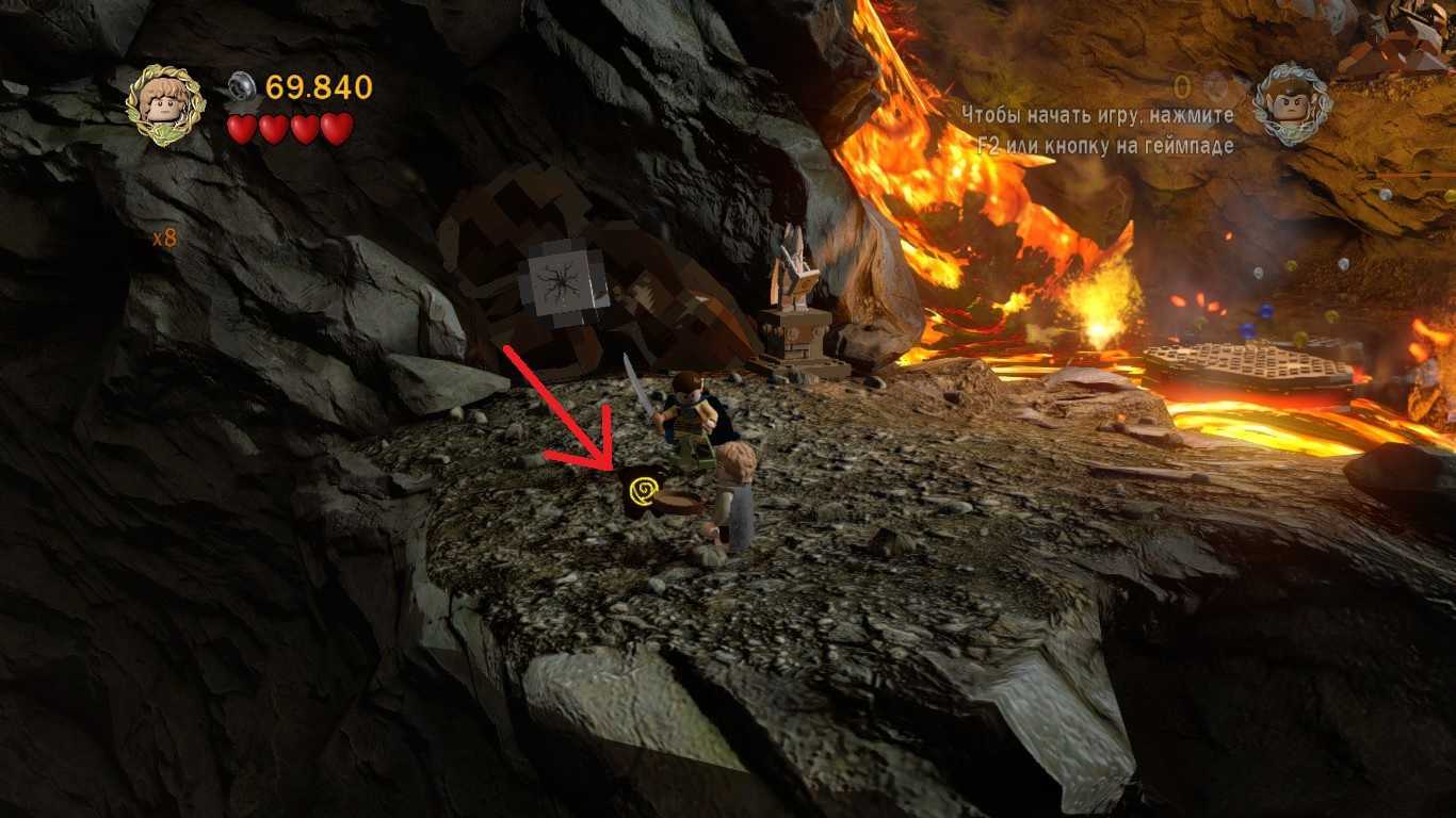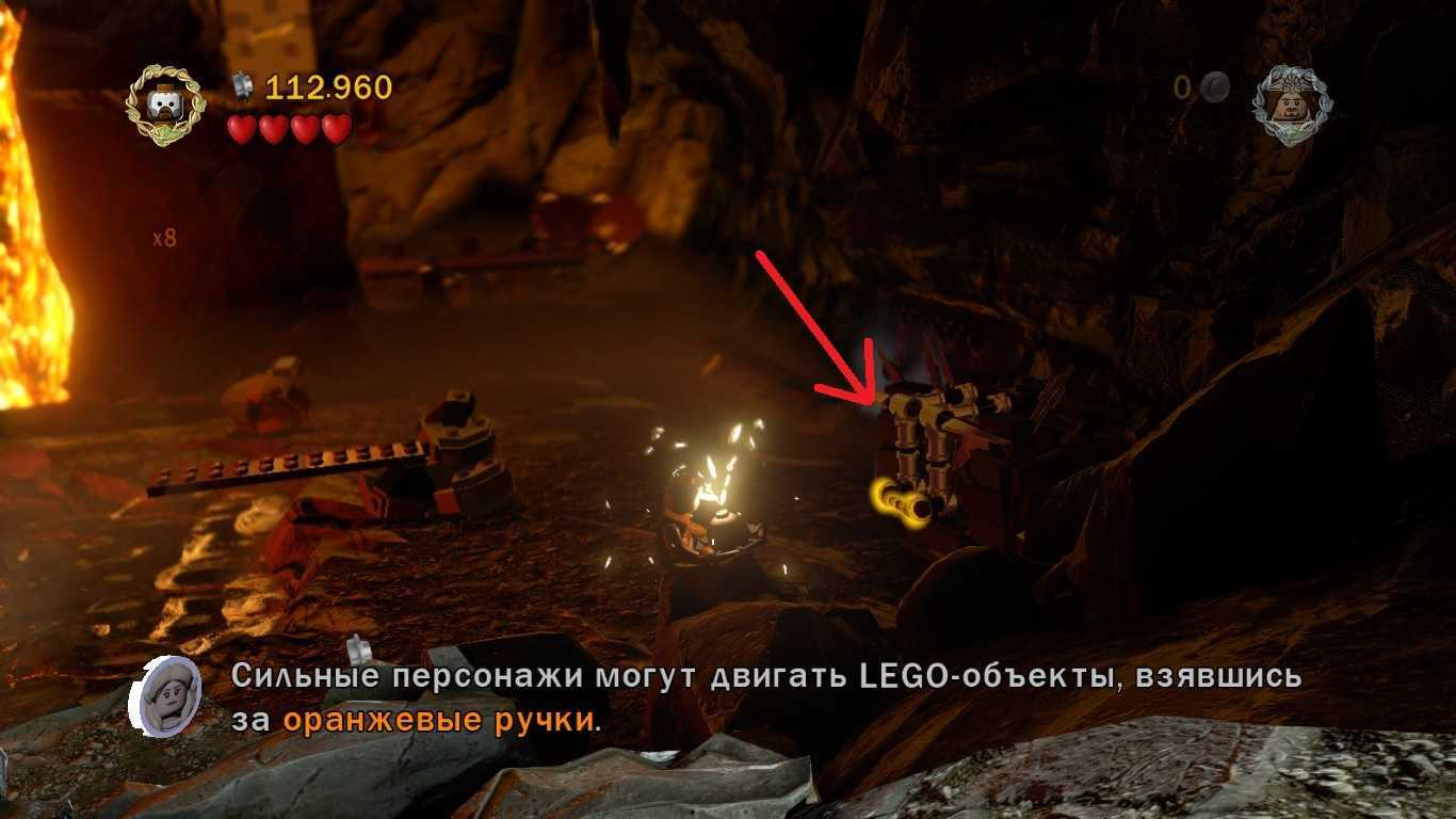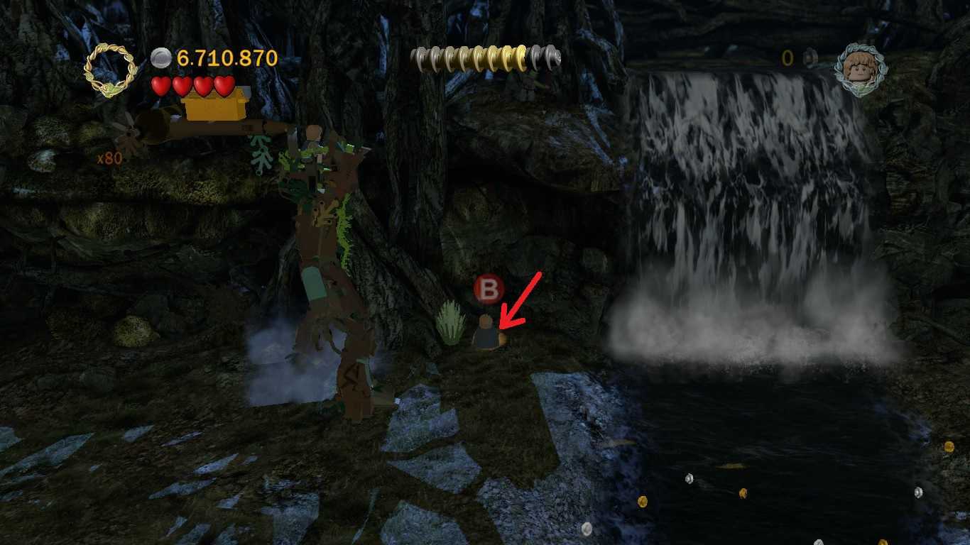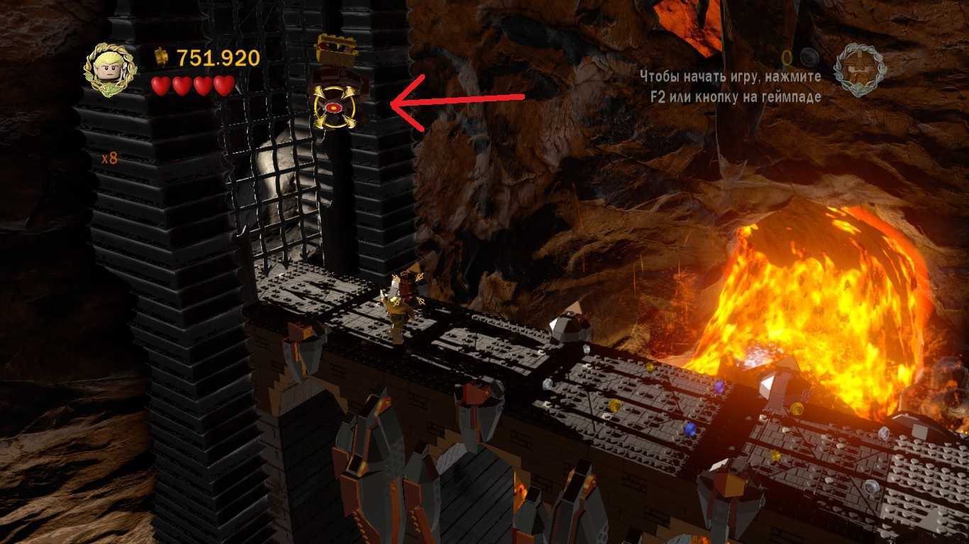 Справа на стене разлом, который может разбить Гимли. Бросаем его и попадаем в секретную локацию. При помощи мифрильной веревки или, опять же, Сэма, забираемся на площадку, причем обоими персонажами. Снова бросаем Гимли, затем переключаемся на Голума и забираемся еще выше. Дальше при помощи меча Арагорна (или Элендила, кому как больше нравится) разбиваем моргульские блоки. Хлынет поток лавы, который вынесет третий мини-кит в бассейн.