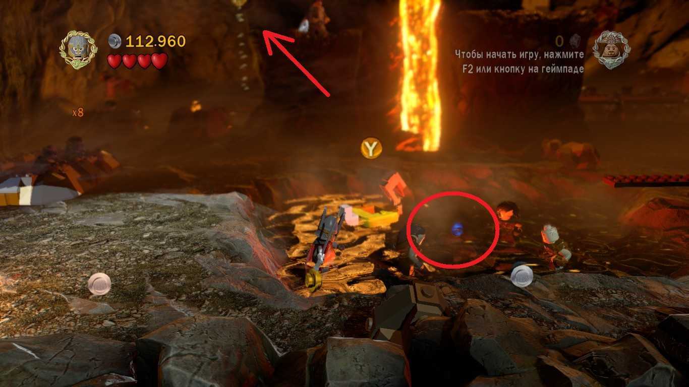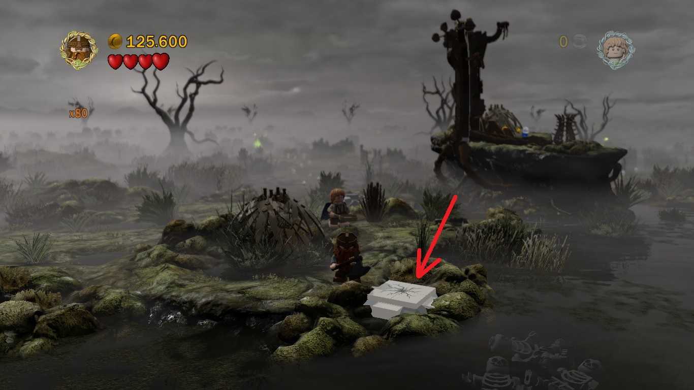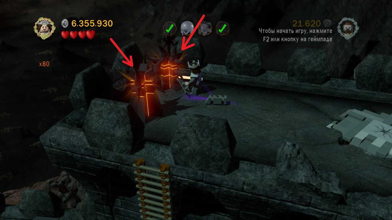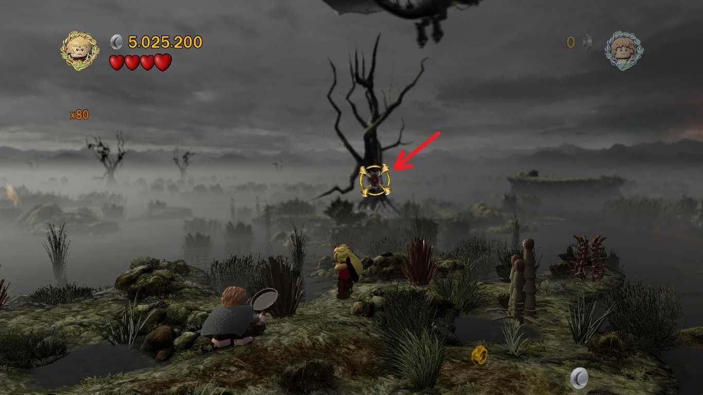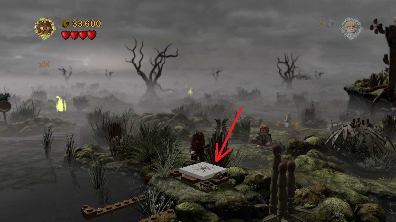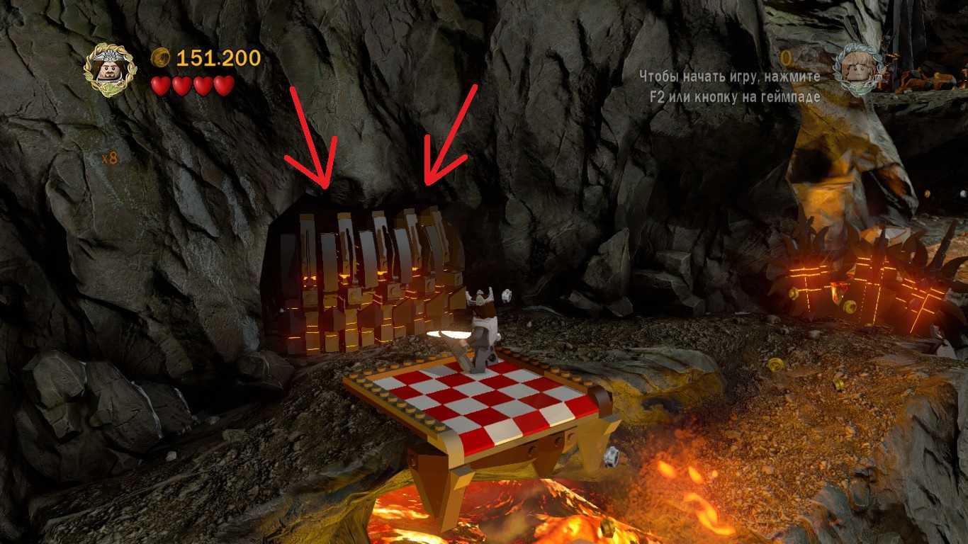 Справа на стене разлом, который может разбить Гимли. Бросаем его и попадаем в секретную локацию. При помощи мифрильной веревки или, опять же, Сэма, забираемся на площадку, причем обоими персонажами. Снова бросаем Гимли, затем переключаемся на Голума и забираемся еще выше. Дальше при помощи меча Арагорна (или Элендила, кому как больше нравится) разбиваем моргульские блоки. Хлынет поток лавы, который вынесет третий мини-кит в бассейн.