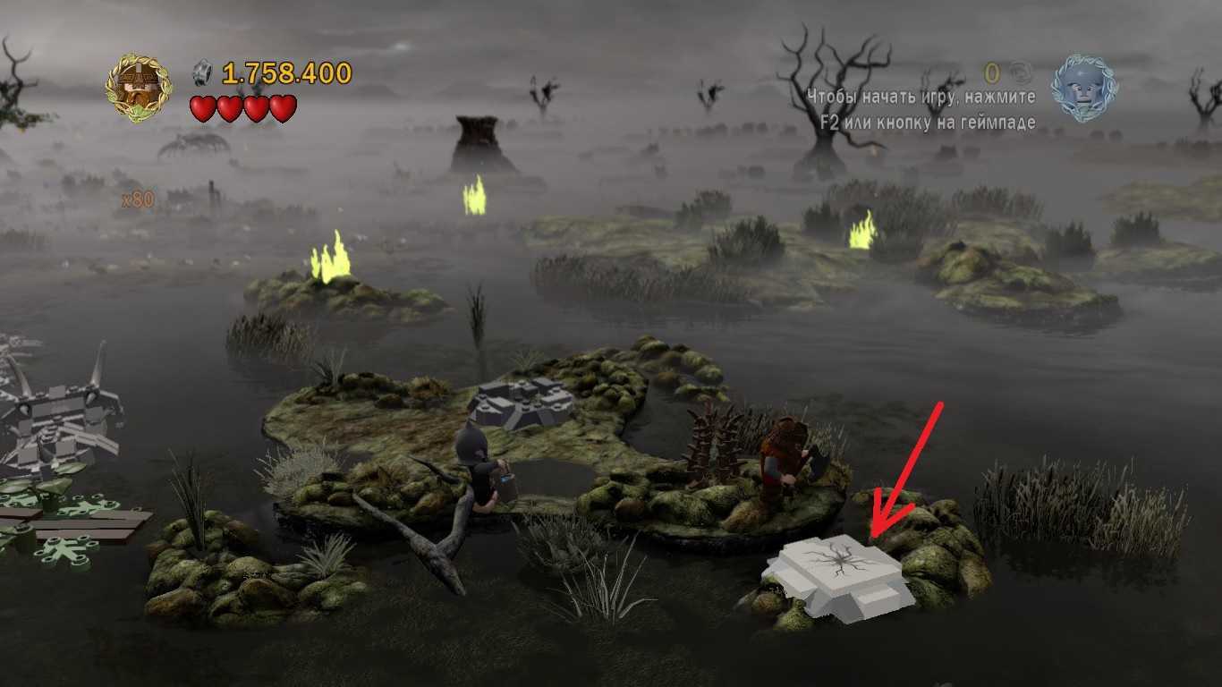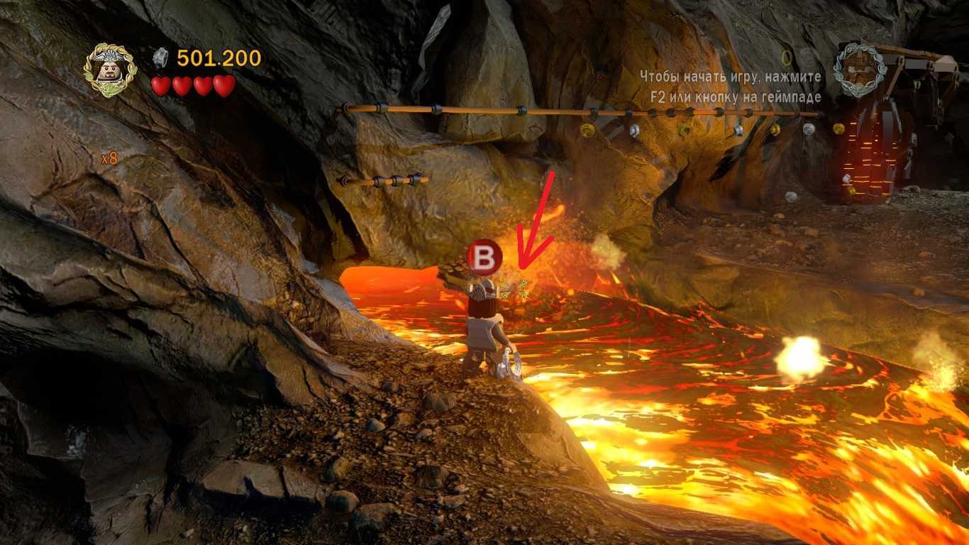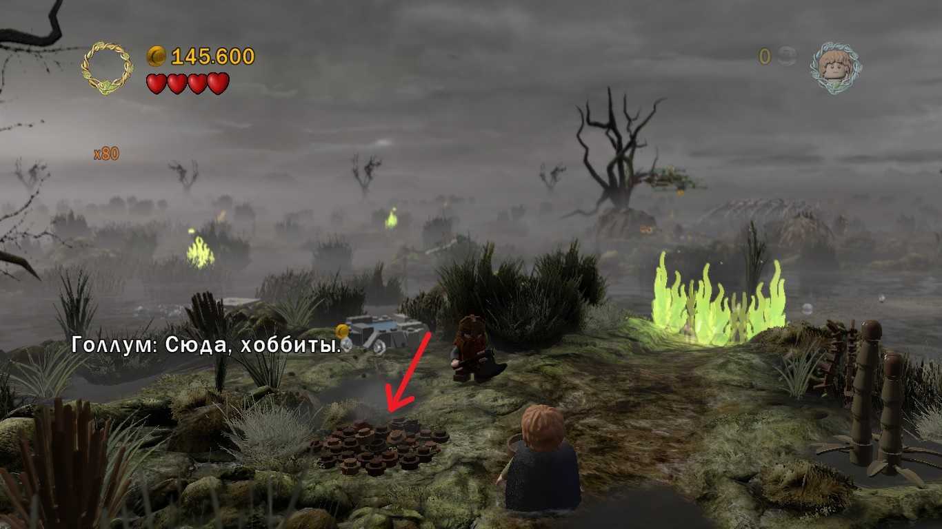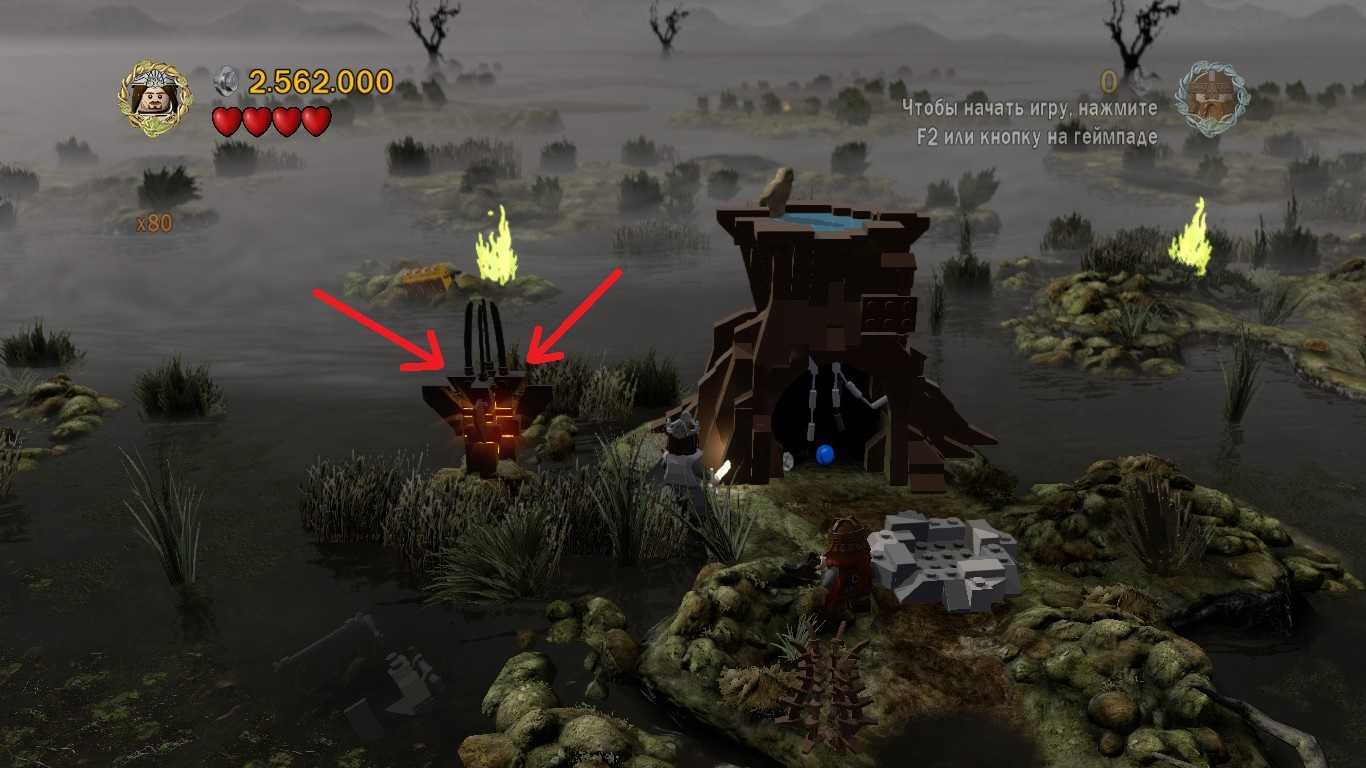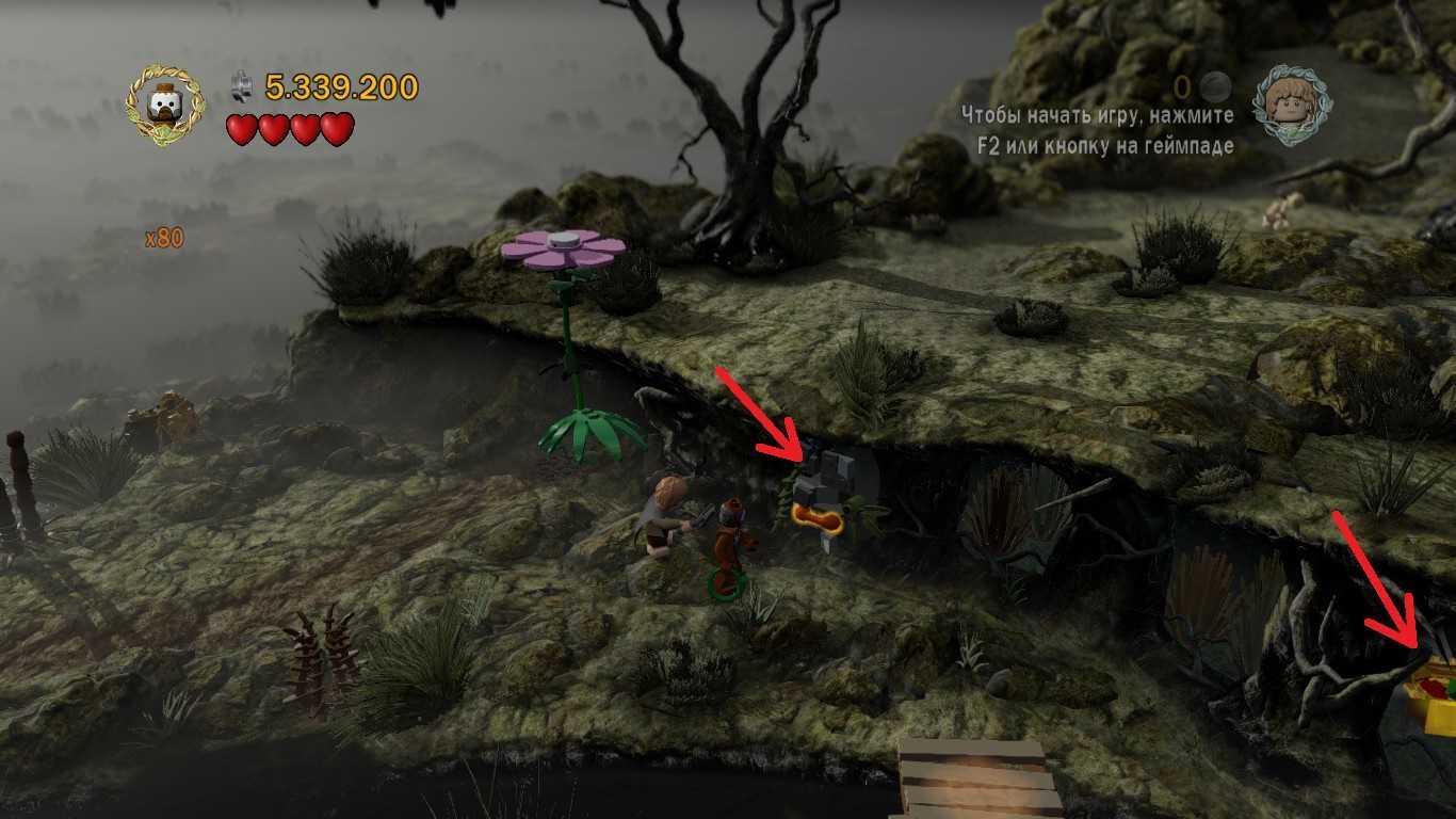 Справа на стене разлом, который может разбить Гимли. Бросаем его и попадаем в секретную локацию. При помощи мифрильной веревки или, опять же, Сэма, забираемся на площадку, причем обоими персонажами. Снова бросаем Гимли, затем переключаемся на Голума и забираемся еще выше. Дальше при помощи меча Арагорна (или Элендила, кому как больше нравится) разбиваем моргульские блоки. Хлынет поток лавы, который вынесет третий мини-кит в бассейн.