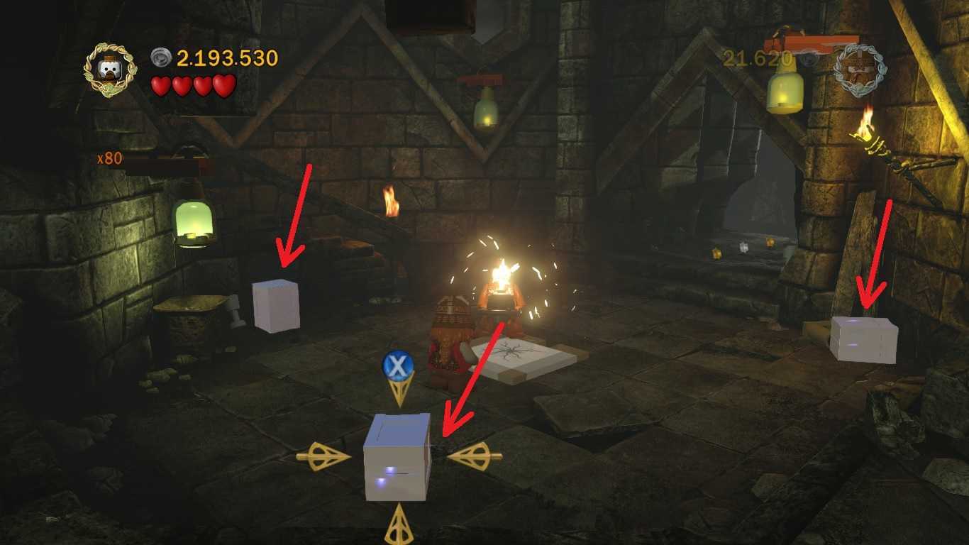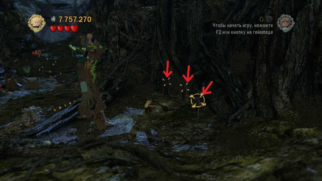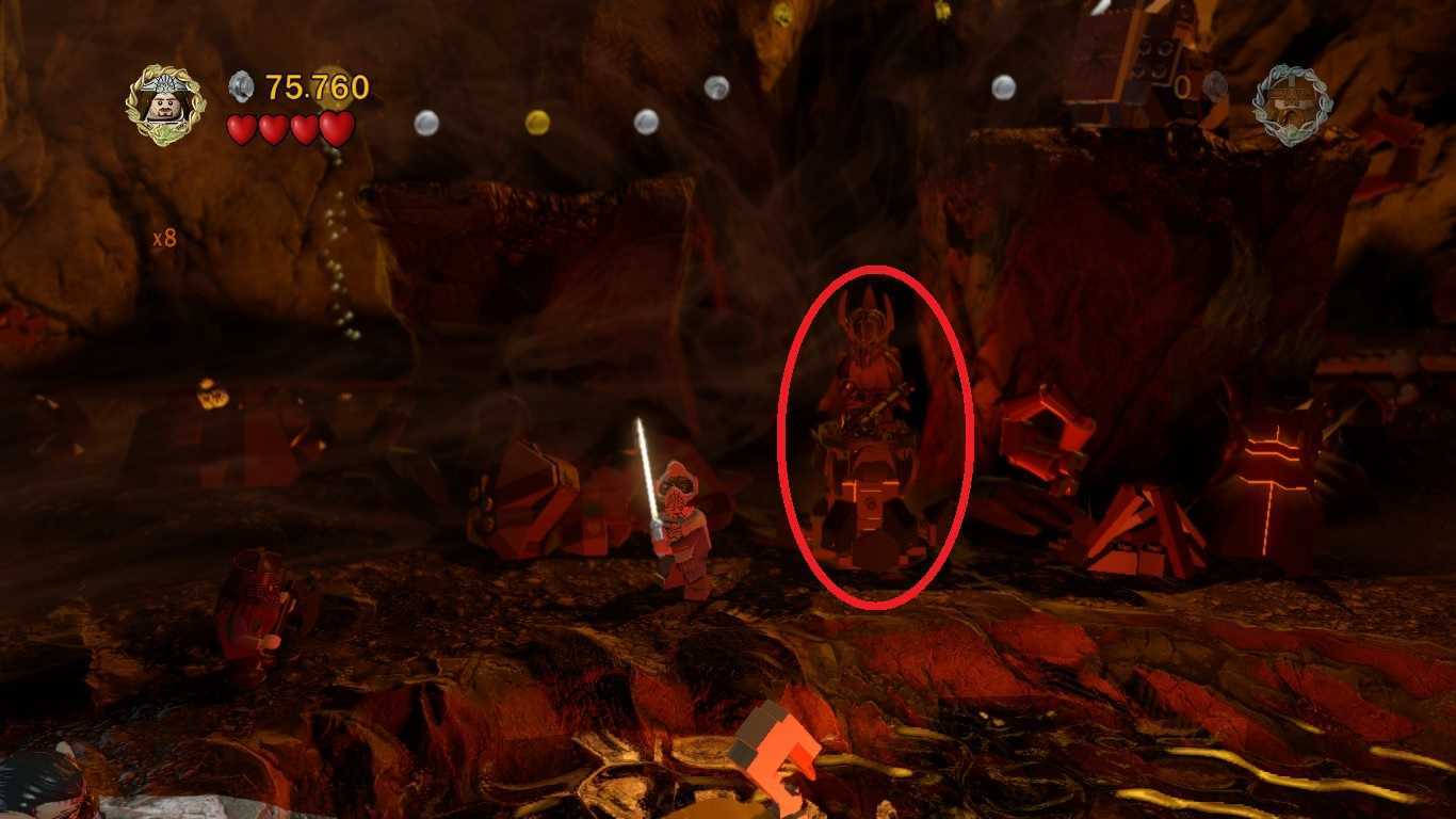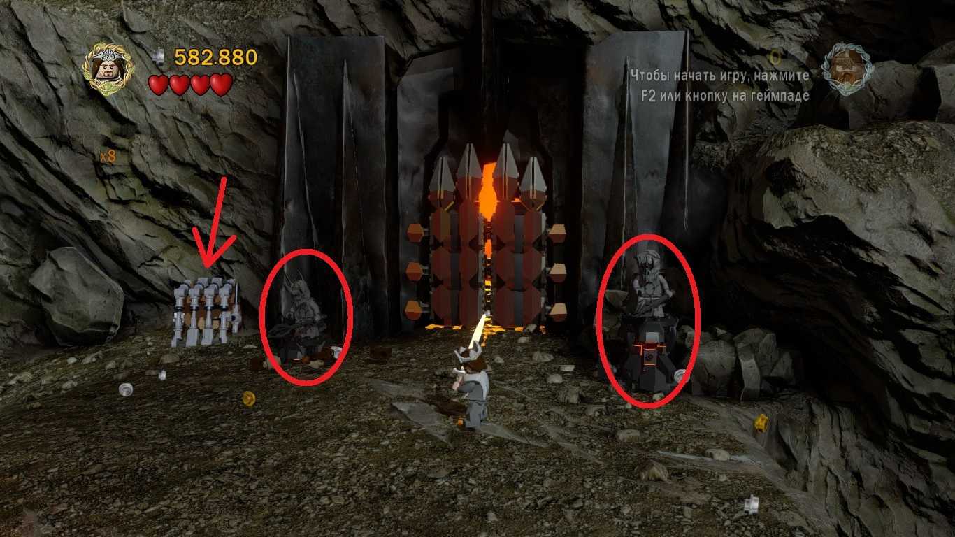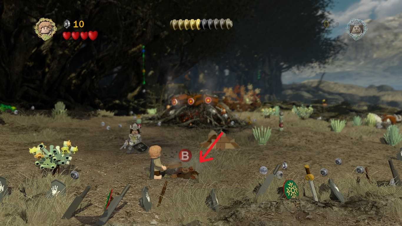 Во время битвы с Сауроном, разбиваем серебряные блоки, используя бомбы Берсерка, и мы получим первое сокровище.