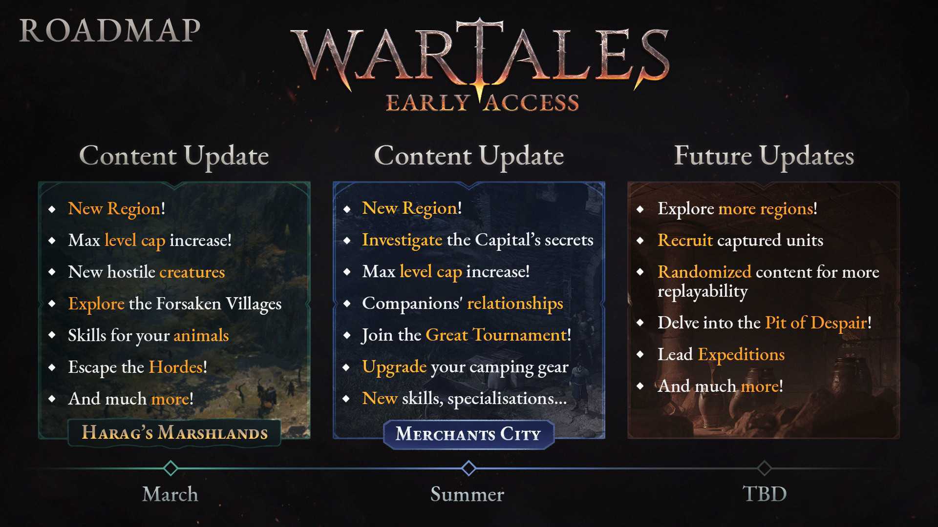На странице тайтла в Steam появилась таблица интеграции нового контента. В 2022-ом году Wartales пополнится свежей локацией, дополнительными врагами и навыками героев. Максимальный уровень прокачки персонажей и животных станет выше. Первый пак обновлений выйдет уже в марте. Набор получил название Harag`s Marshlands. Игроку предстоит исследовать заброшенные деревни.