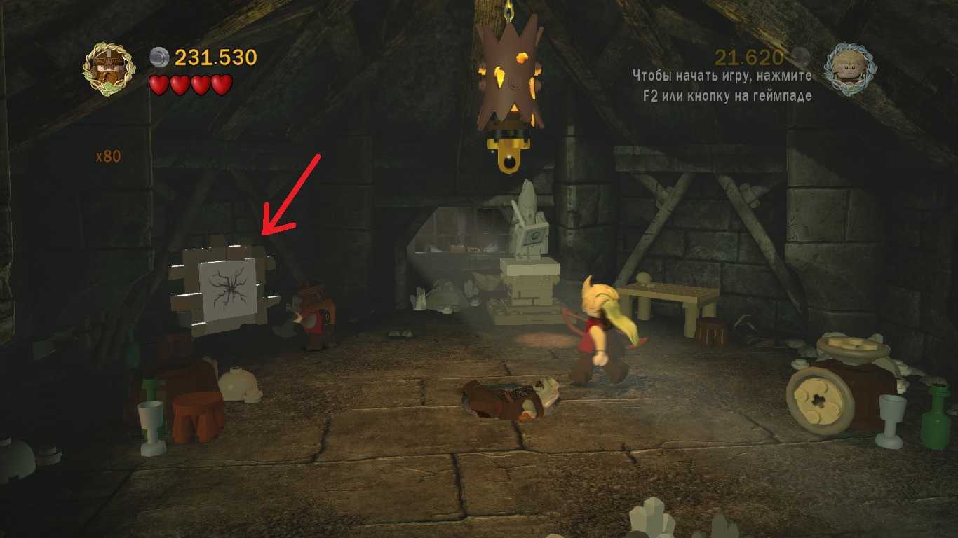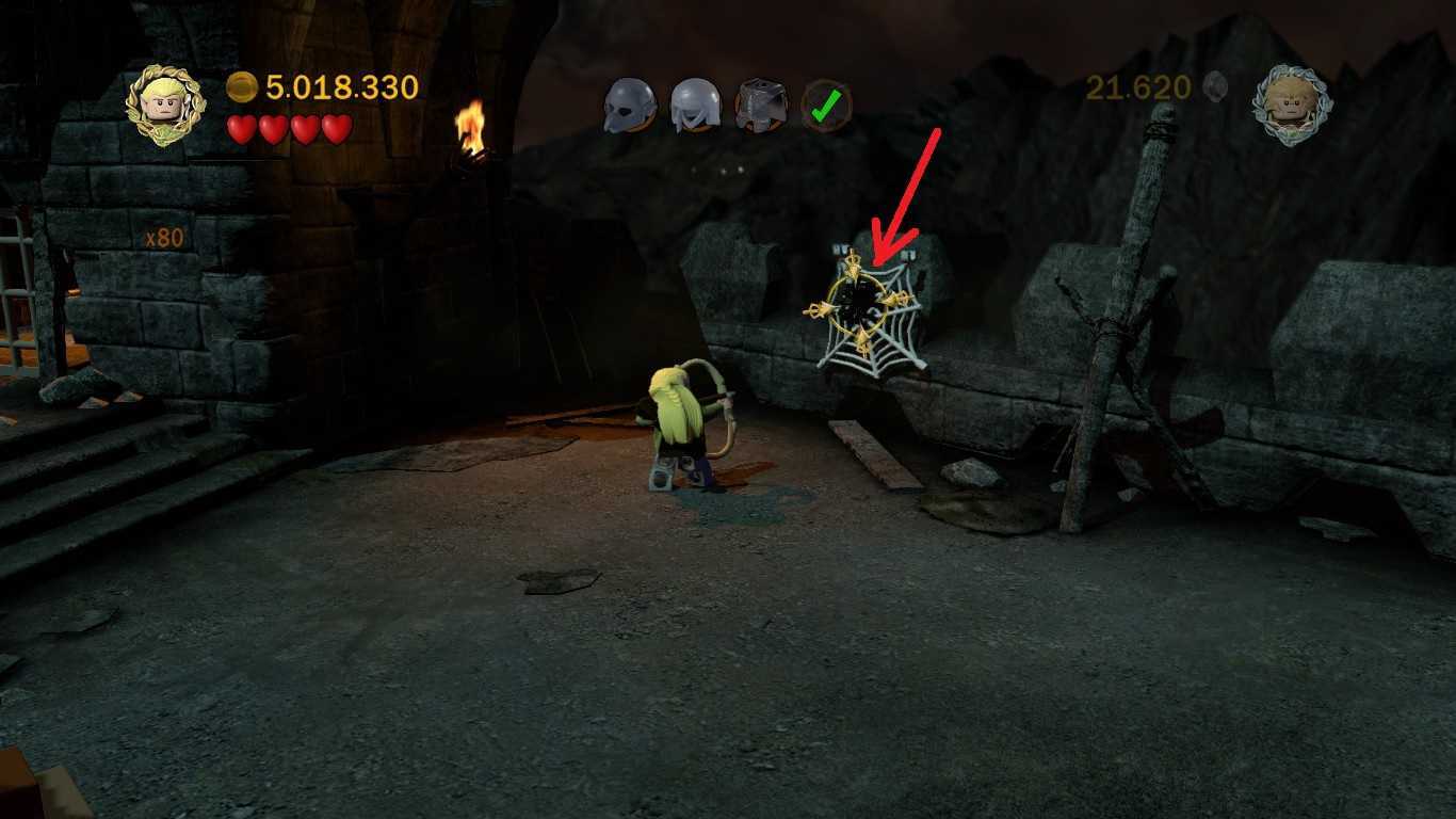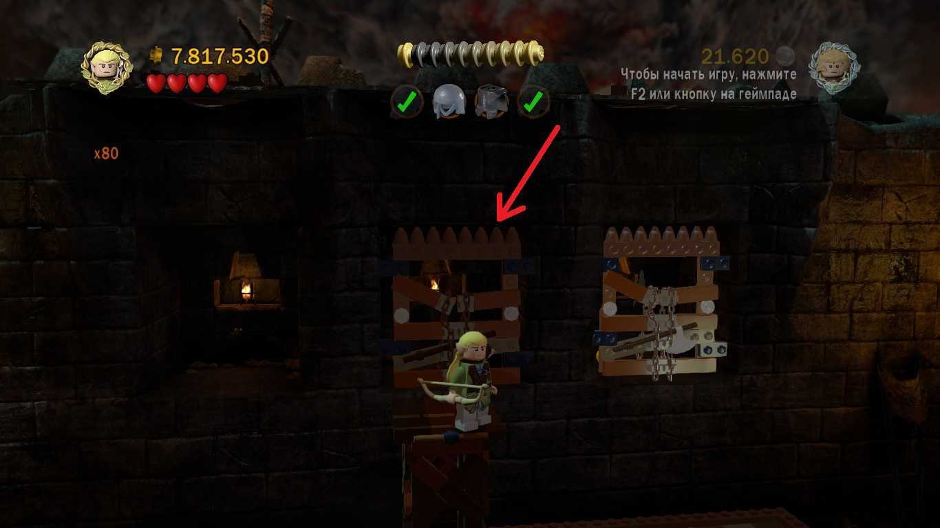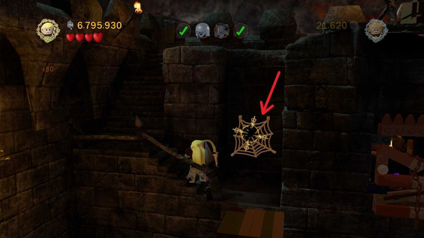 Сразу же на входе, выбираем Леголаса и разбиваем клетку у нас над головой. Та-дам. Десятый мини-набор наш.