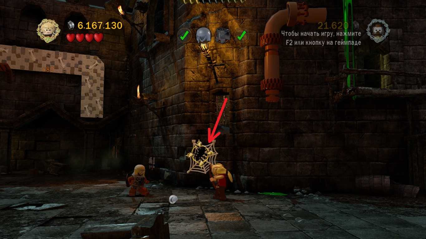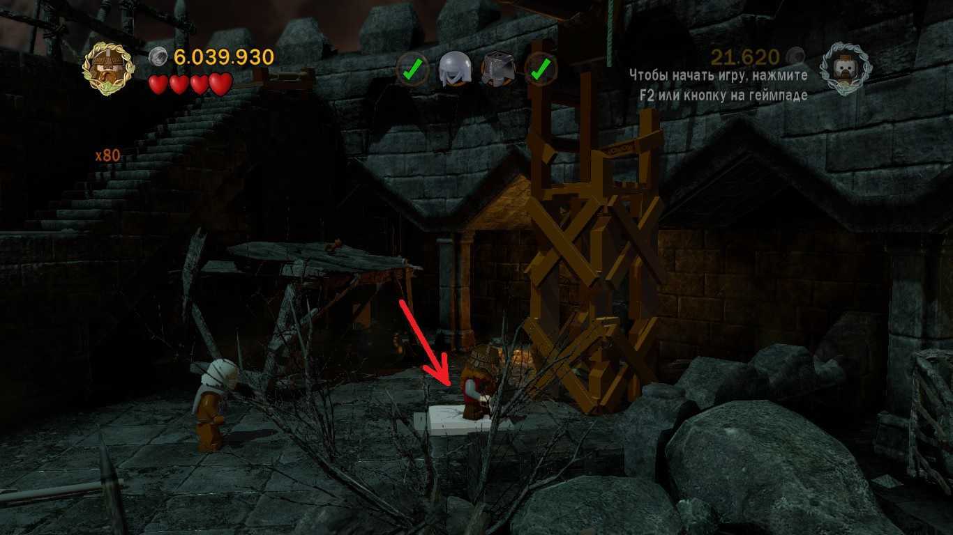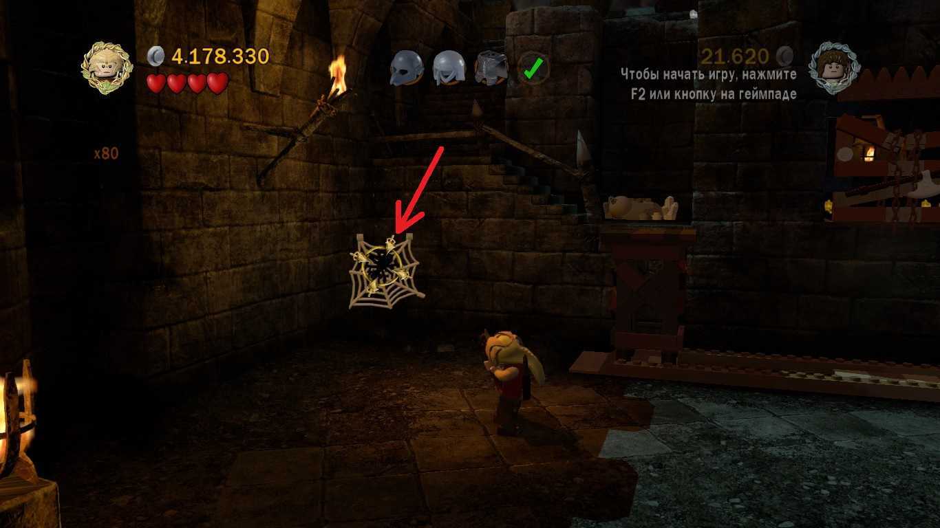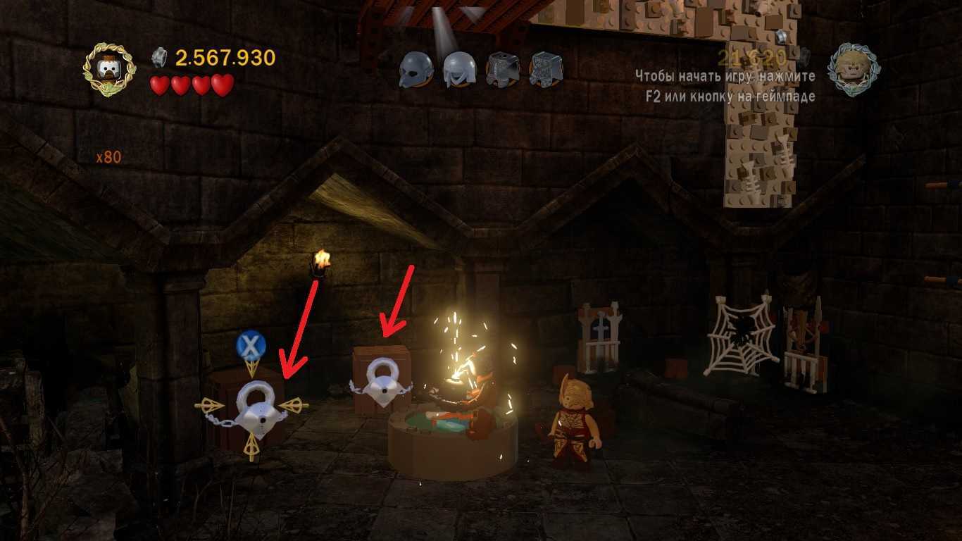 Сразу же на входе, выбираем Леголаса и разбиваем клетку у нас над головой. Та-дам. Десятый мини-набор наш.