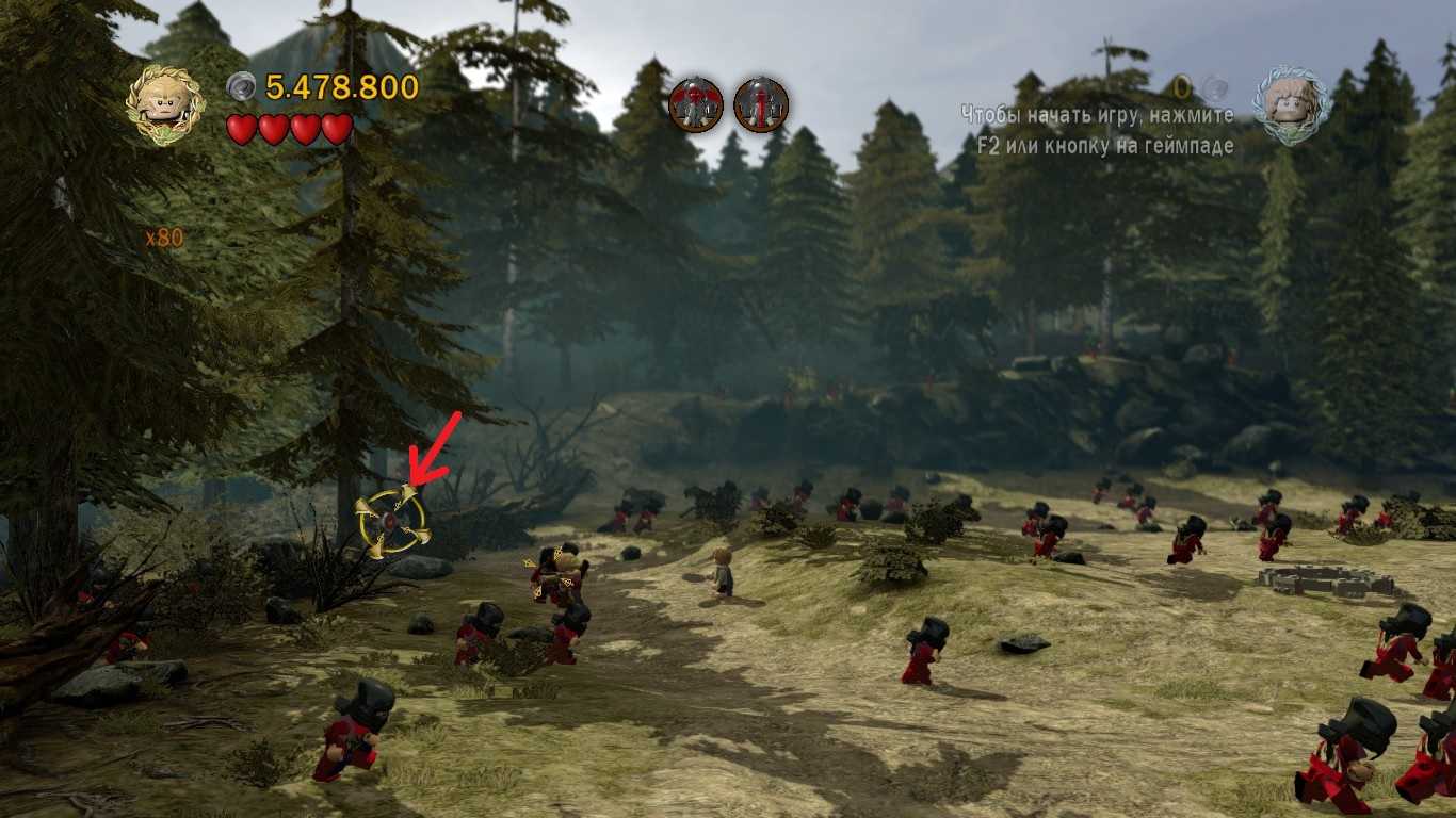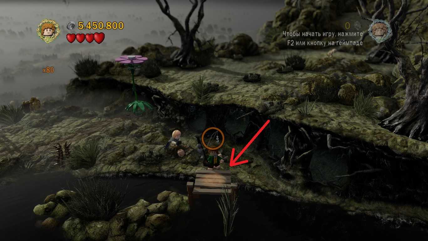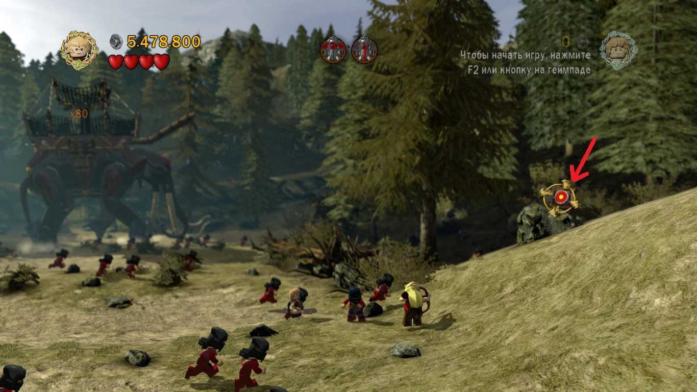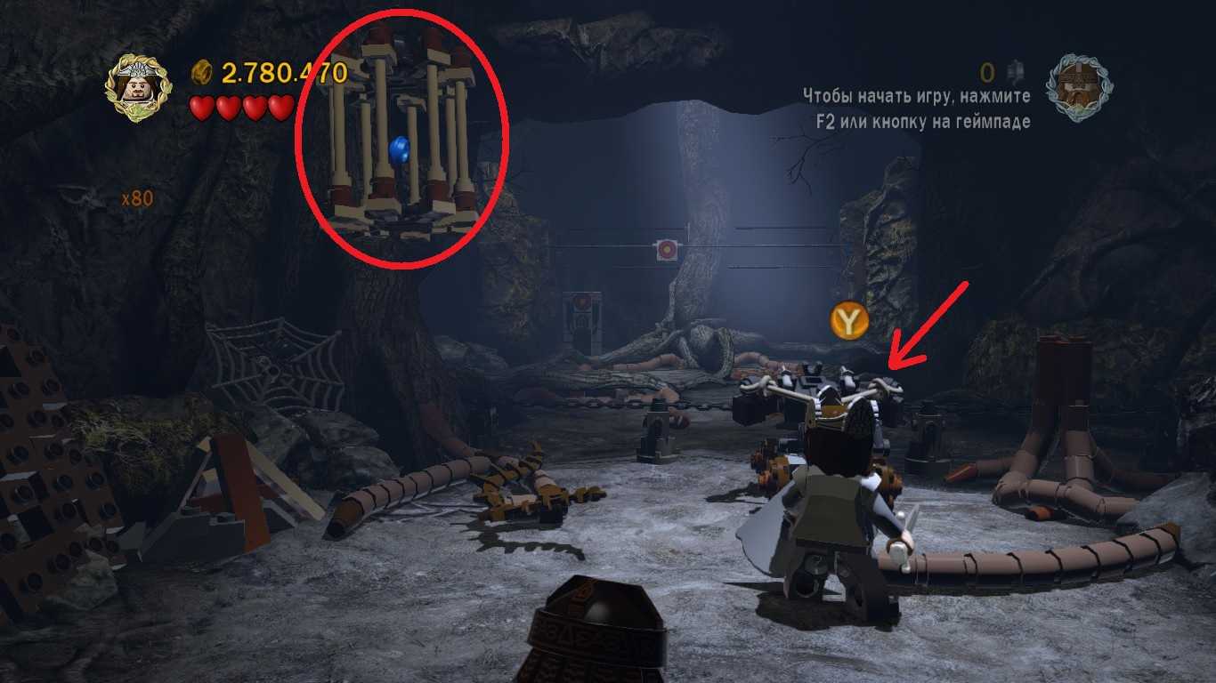 Сразу же на входе, выбираем Леголаса и разбиваем клетку у нас над головой. Та-дам. Десятый мини-набор наш.