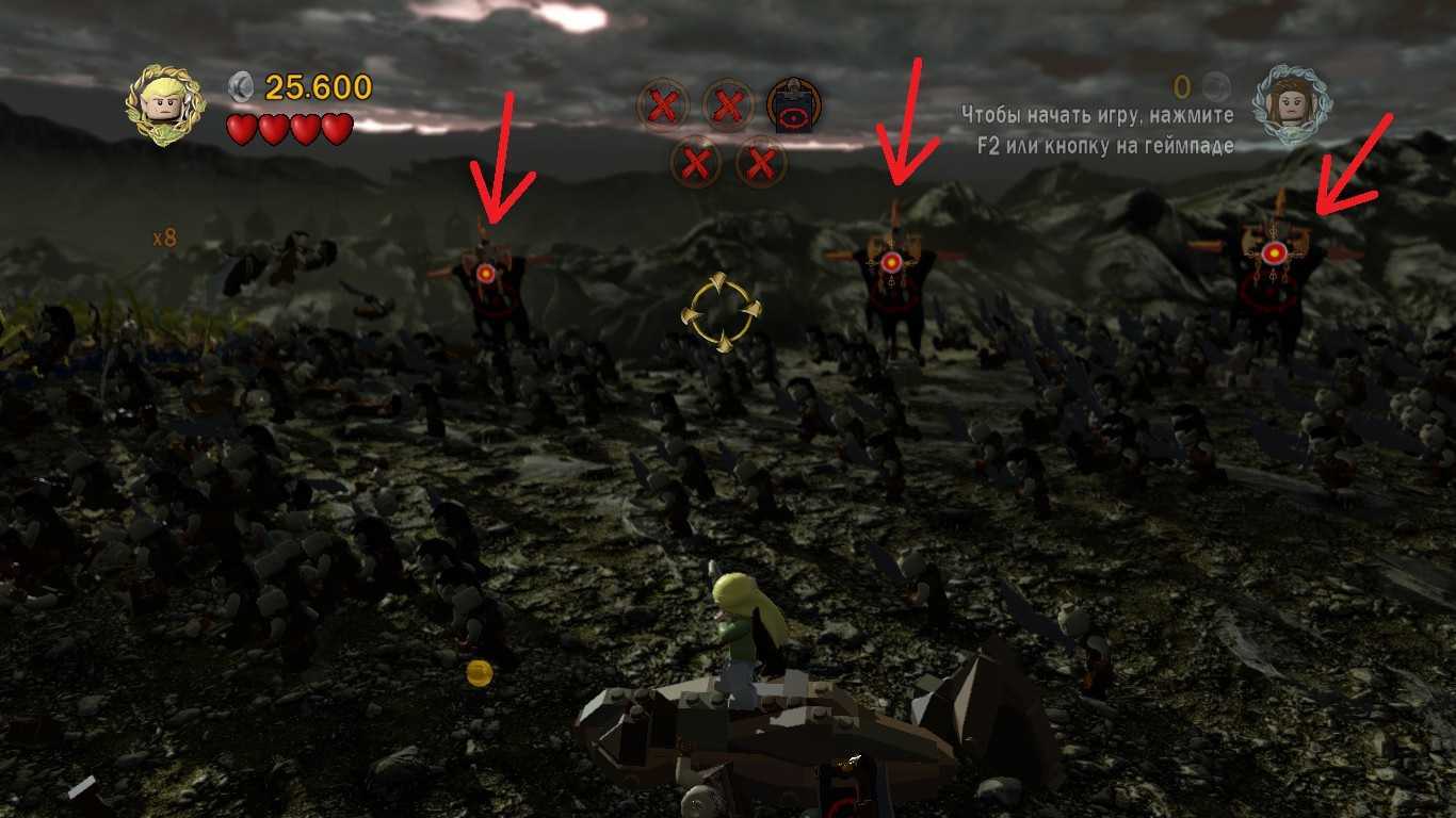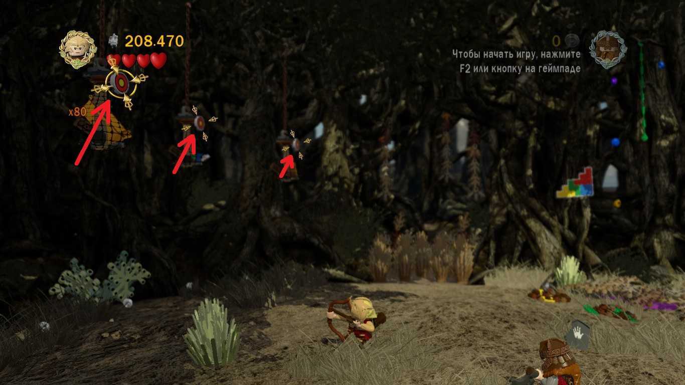Сразу после того, как получили первый мини-кит, выбираем Леголаса и стреляем в три мишени на заднем плане и второй мини-кит наш.