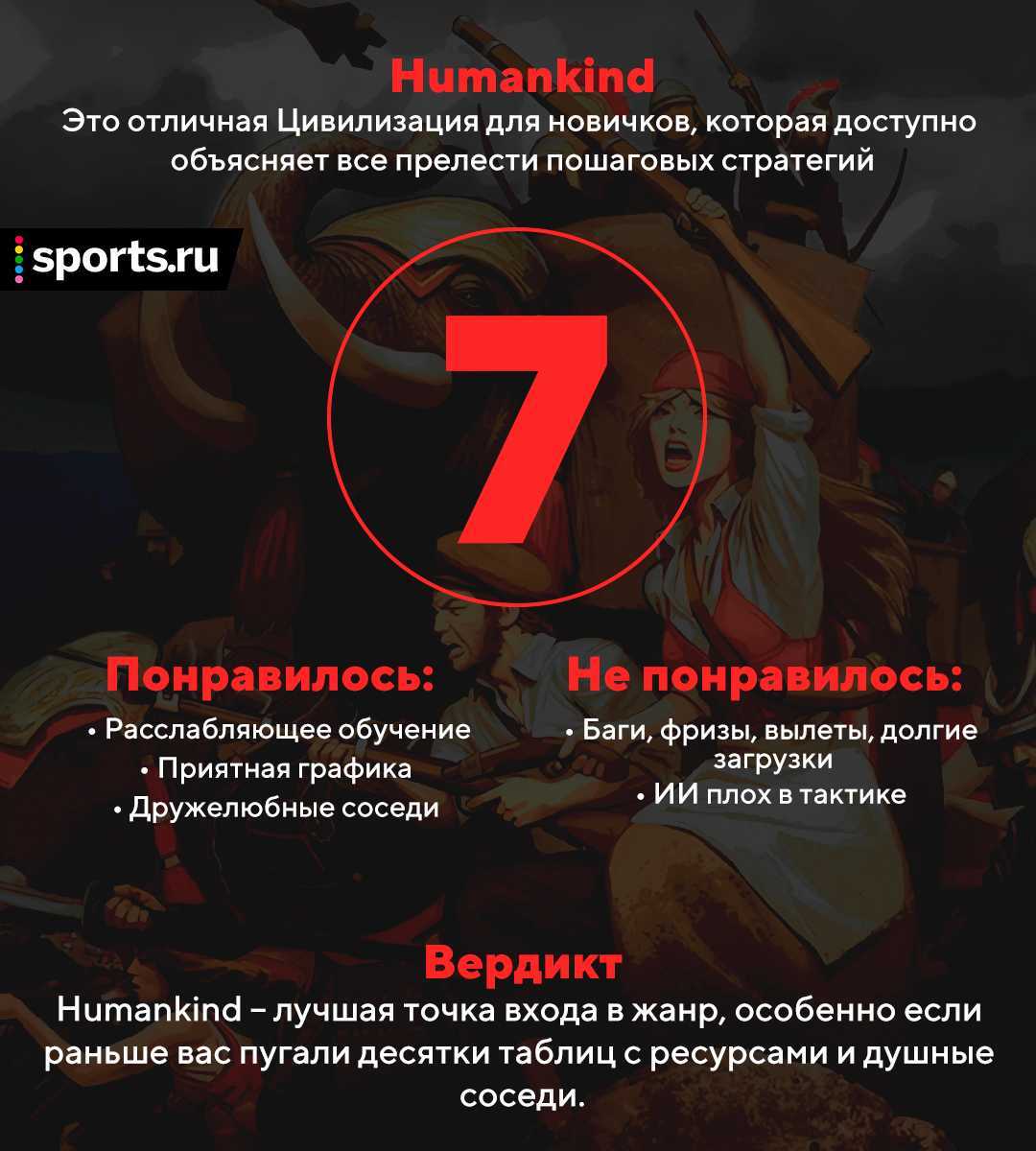Humankind – это отличная Цивилизация для новичков, которая доступно объясняет все прелести пошаговых стратегий. Однако фанатам Paradox она покажется слишком простой и миролюбивой. Покупать игру сейчас можно, но только если вы очень соскучились по Цивам и готовы закрыть глаза на бесящие неисправности. Остальным лучше подождать патчей и скидок. Но игру добавили в Xbox Game Pass для ПК, и если есть активная подписка, обязательно попробуйте, ведь Humankind – лучшая точка входа в жанр, особенно если раньше вас пугали десятки таблиц с ресурсами и душные соседи.