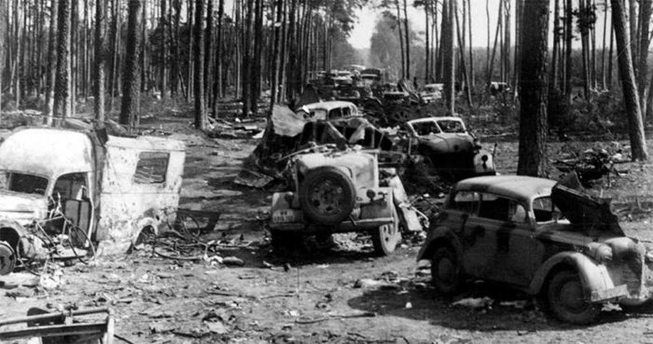 «Картина такая: впереди Берлин, справа просека, сплошь забитая чем-то совершенно невероятным — нагромождение танков, легковых машин, броневиков, грузовиков, специальных машин, санитарных автобусов. Все это буквально налезшее друг на друга, перевёрнутое, вздыбленное, опрокинутое и, очевидно, в попытках развернуться и спастись искрошившее вокруг себя сотни деревьев.