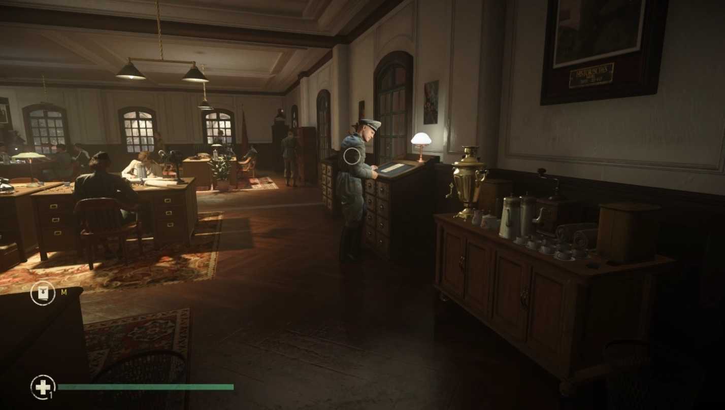 Внутри сразу поверните налево и идите в коридор. Слева есть немецкий офицер — подойдите и поговорите с ним, чтобы узнать, где находится ваш информатор.