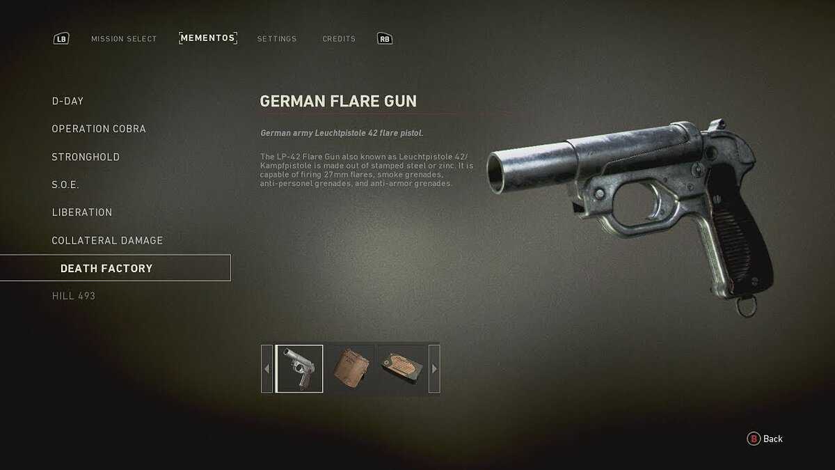 Сувенир №19 — Немецкий сигнальный пистолет (German Flare Gun). Как только вы достигните зоны с несколькими снайперами и тройкой грузовиков посреди леса, то на одном из ящиков или ящик, — ёмкость (вместилище) в форме многогранника, чаще всего — прямоугольного параллелепипеда позади машины можно подобрать сигнальный пистолет ручное короткоствольное стрелковое оружие, предназначенное для поражения целей на дальности до 25—50 метров.