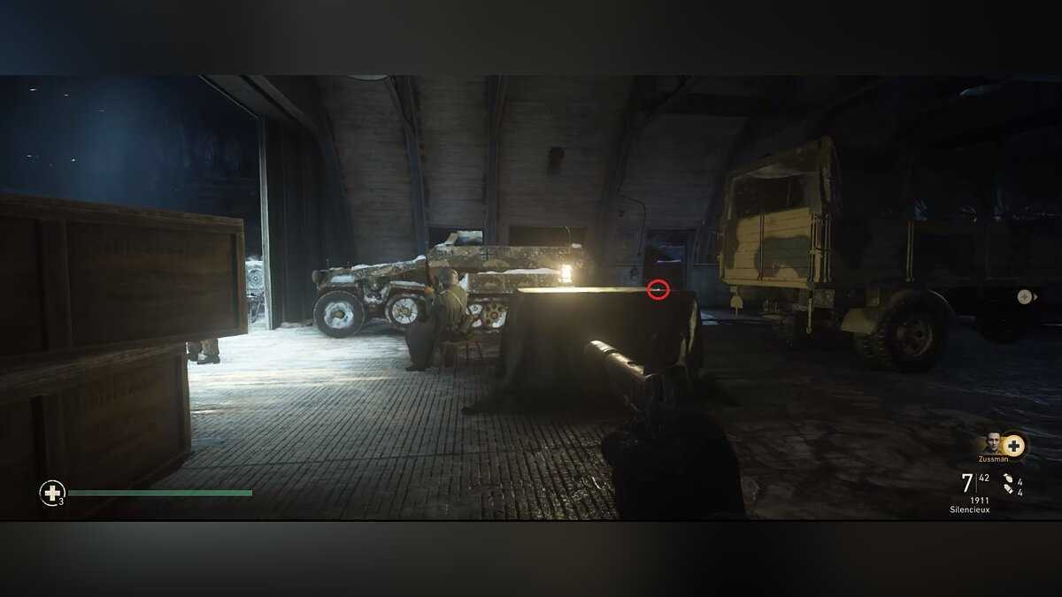 Солдат, стоящий у входа, попросит документы и пропустит вас. Спуститесь в подвал, где вы окажетесь в комнате со спящим охранником. Воспользуйтесь этой возможностью и освободите партизан из камеры. Идите дальше налево за дверь. Войдите в комнату за деревянной дверью, чтобы спасти еще одного человека.