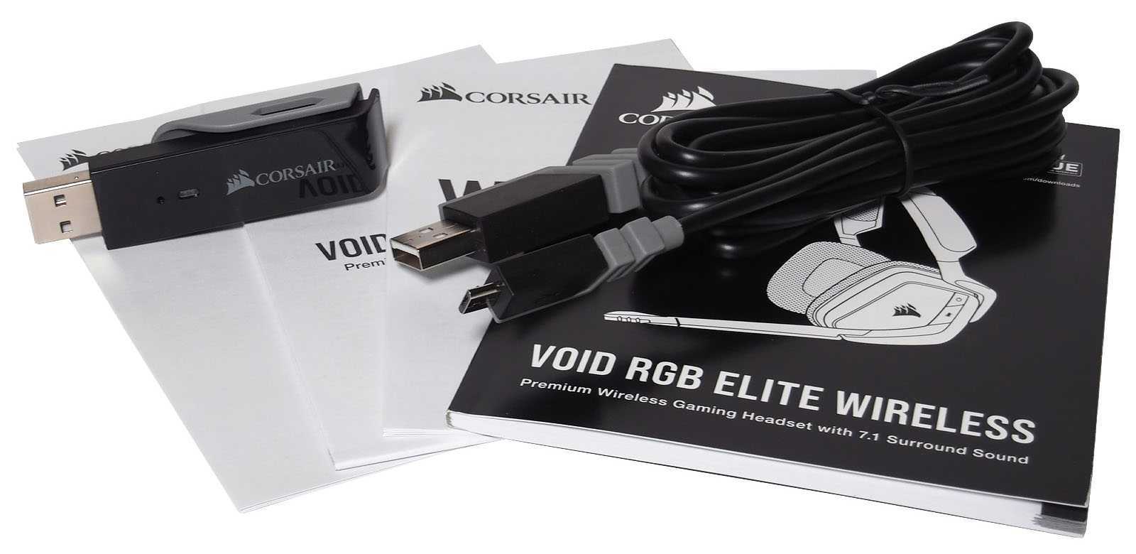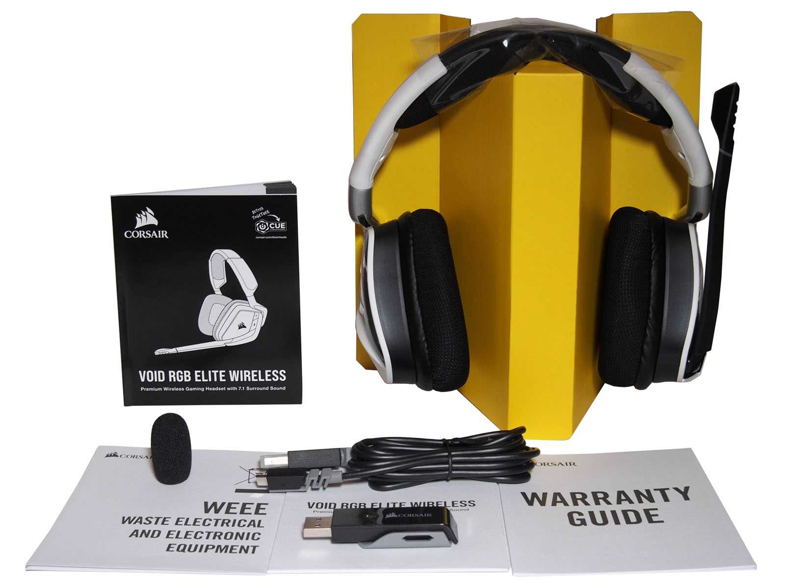 Corsair Void Elite Surround поставляются в яркой коробке, внутри которой мы находим сами наушники, USB-адаптер (он же звуковая карта), поп-фильтр для микрофона и разные бумажки. Всё стандартно, минимальный набор есть.