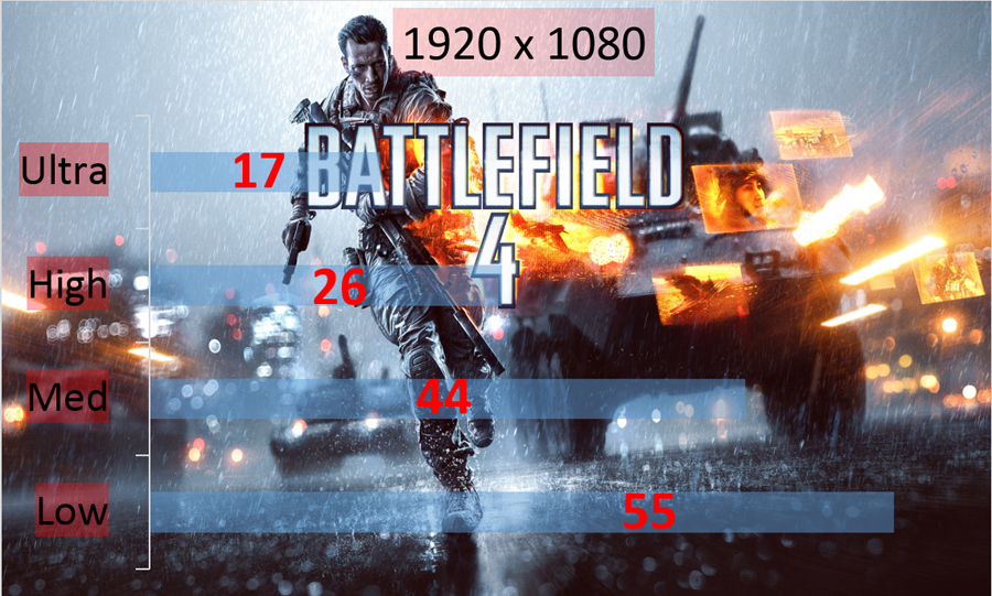 Игра тестировалась на родном разрешении. Пресеты настроек: средние (Medium, 4xAA, AF); высокие (High, 8xAA, 8xAF); ультра (Ultra, 8xAA, 18xAF). На ультра настройках средняя частота кадров равна 30, но в особо «тяжёлых» местах, где много теней, частота кадров проседает до 24. Выставив ультра настройки, и снизив сглаживание до 4хАА, вы получите стабильные 40 FPS.