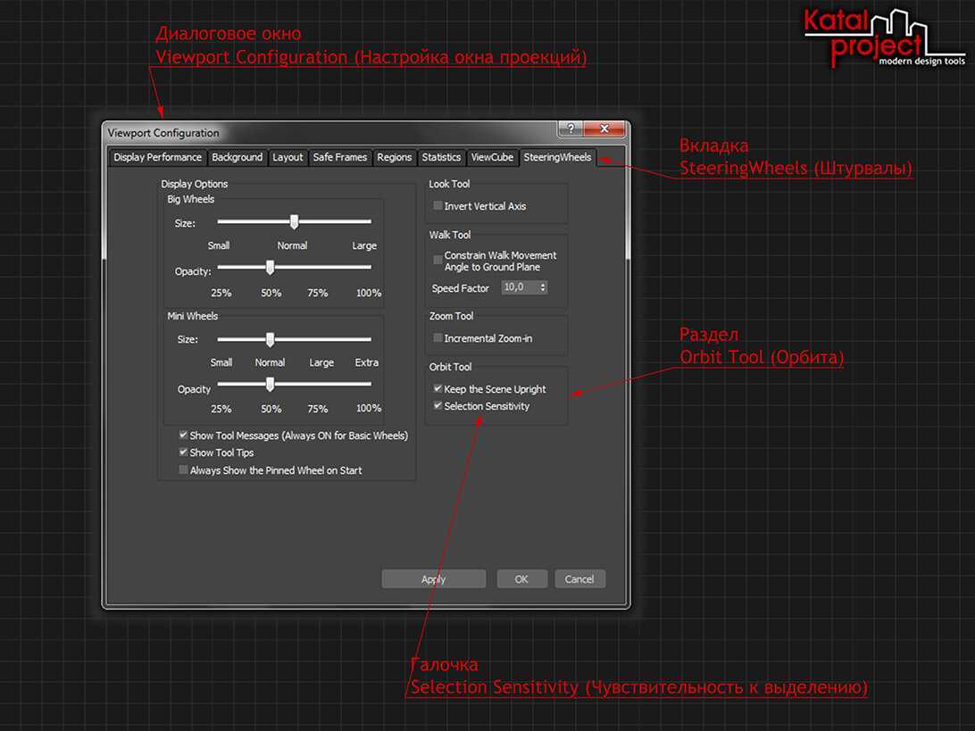 Галочка Selection Sensitivity в разделе Orbit Tool вкладки SteeringWheels диалогового окна Viewport Configuration