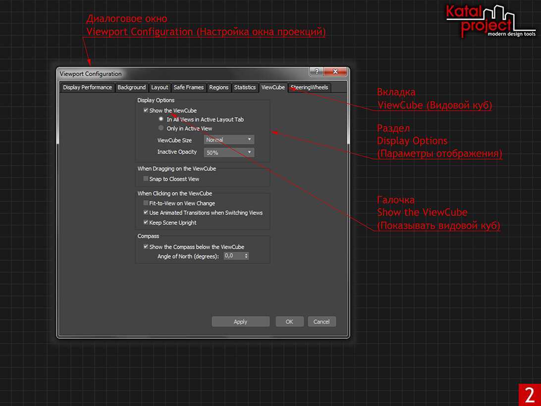- Открыть диалоговое окно «Viewport Configuration» (Настройка окна проекций) , перейти во вкладку «ViewCube» (Видовой куб) и снять галочку «Show the ViewCube» (Показывать видовой куб), которая располагается в разделе «Display Options» (Параметры отображения);