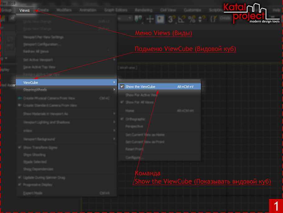 Отключение ViewCube: 1 — Команда Show the ViewCube в меню Views; 2 — Галочка Show the ViewCube в диалоговом окне Viewport Configuration; 3 — Команда Show the ViewCube в General Viewport Label Menu; 4 — Команда Toggle ViewCube Visibility в диалоге Search All Actions