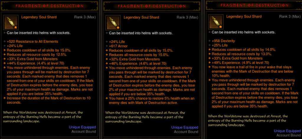 Каждый осколок души имеет свои уникальные характеристики с разными модификаторами и может быть вставлен в гнездо. Всего существует 7 осколков, как указано ниже. 4 осколка для использования с оружием и 3 из них для шлемов .