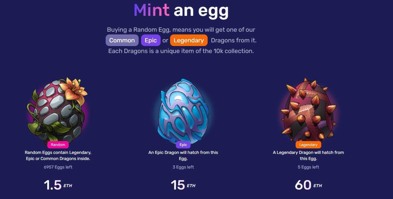 Для того, чтобы начать зарабатывать, получив доступ к предложенным сайтом активностям, нужно сперва приобрести NFT в виде яиц, из которых впоследствии появляются драконы. Яйца делятся на 3 основные категории — согласно градации редкости: