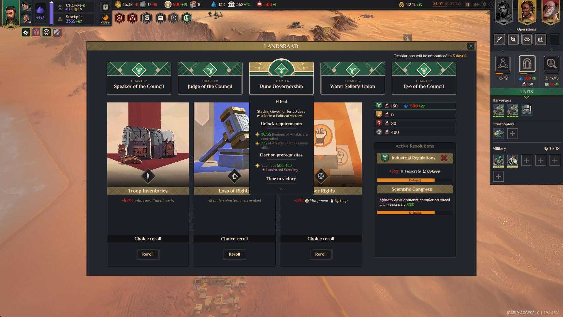 После избрания вы должны сохранять пост в течение 60 дней, после чего вы выиграете игру. Существует выбор для голосования, которое может появиться, которое удаляет всех владельцев чартеров. Если вы проиграете это голосование, вы больше не будете губернатором и должны будете снова выиграть место, а таймер будет сброшен. В целом, это довольно легкая победа, если сосредоточиться, и это была моя первая победа, когда я играл за Дом Атрейдес.