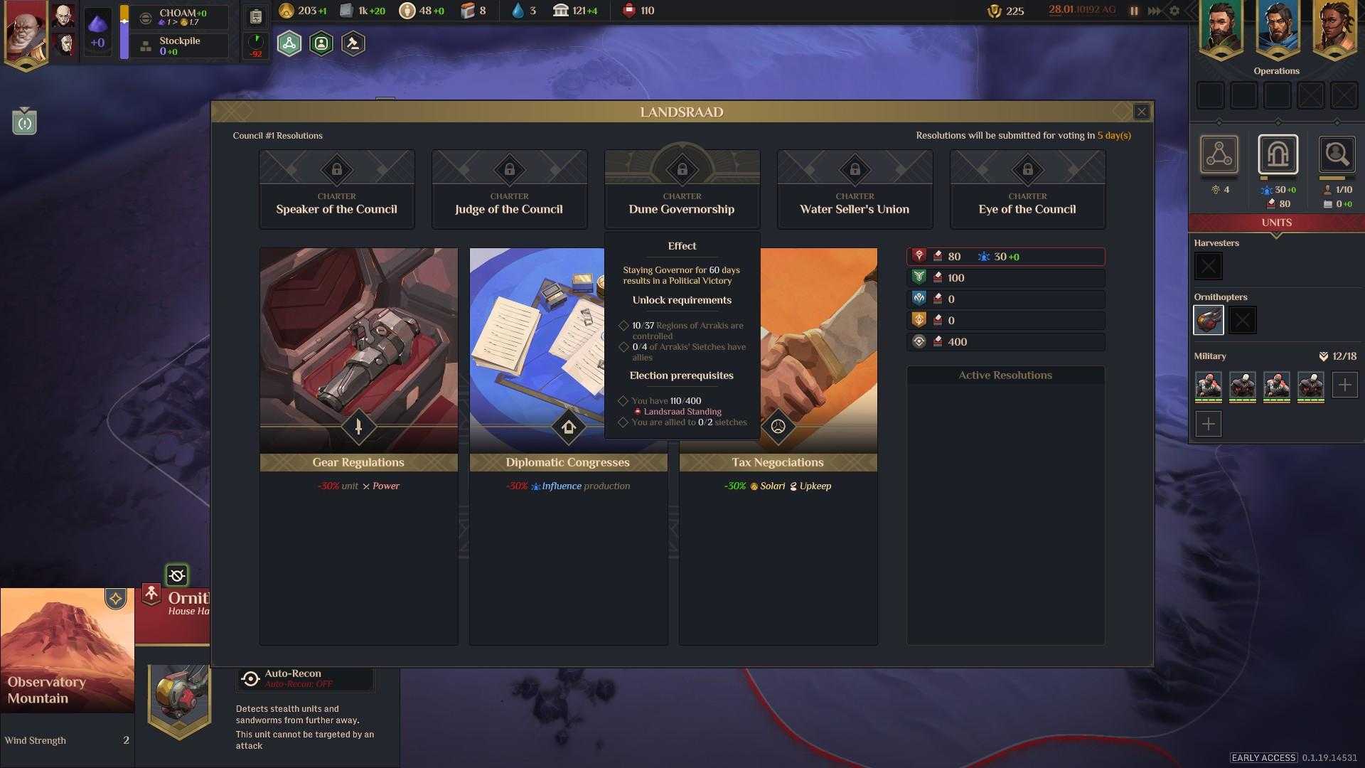 Это будет не единственный раз, когда вам придется практиковать дипломатию. По прошествии нескольких игровых лет на протяжении всего матча у Совета Ландсраада будет голосование. Эти голоса позволят каждой фракции накладывать баффы и дебаффы друг на друга или на весь регион и получать преимущества для себя. Игрокам придется научиться жонглировать всеми этими различными областями управления. Также следите за своими территориями, чтобы атаковать небольшие города, другие фракции и повстанцев изнутри.