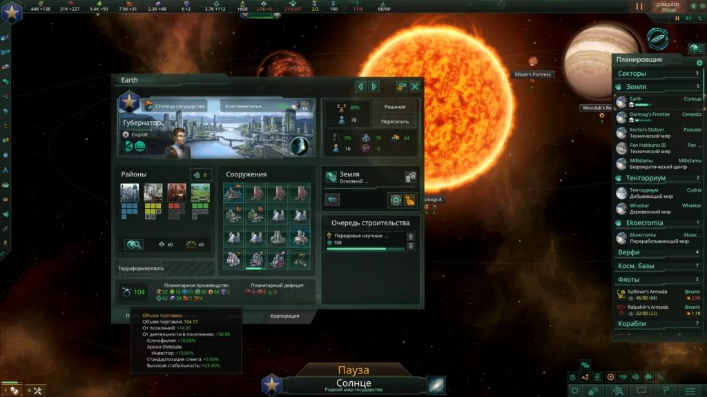 Еще одно изменение касается основных миров. Ваша родная планета автоматически считается основным миром, как и все другие колонии, которым назначен губернатор. Это единственные планеты, которыми вы можете управлять вручную (т. е. строить улучшения клеток или переключать специализацию граждан).