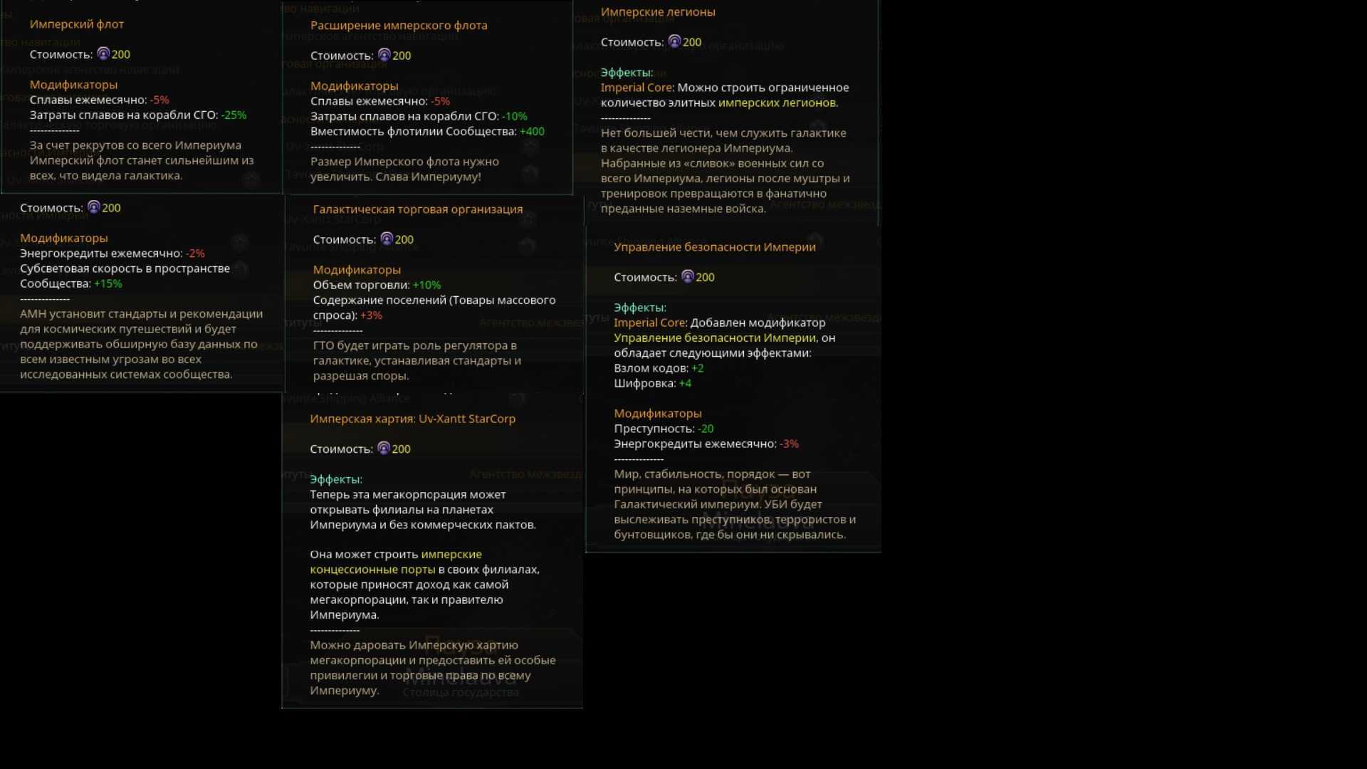 - Имперские реформы. Резолюцию галактический мир можно предложить только, если власть империума больше 180 очков.