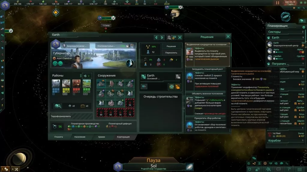 - В окне «Решения» выбрать «Выдвижение кандидатом на основание галактического рынка». Цена решения составляет 1000 энергокредитов и 150 очков влияния.