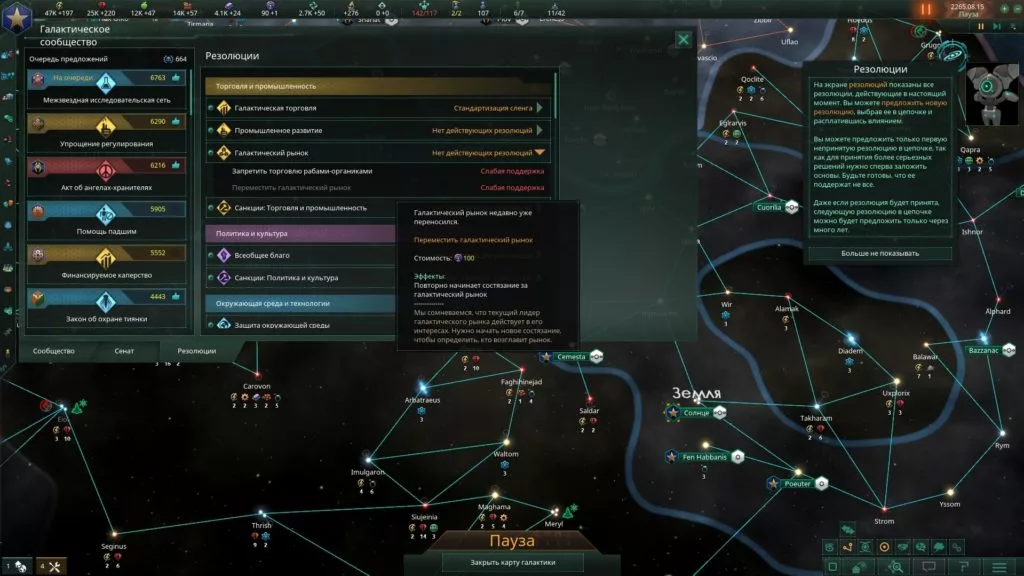 Статус основателя галактического рынка добавит вашей империи модификатор на «+10000 к вместилищу ресурсов». Это хороший показатель, который эквивалентен 4 постройкам типа «хранилище ресурсов». Данный статус гарантирует, что в вашу цивилизацию потекут предложения о заключении торговых договоров со всех уголков галактики.Но в случае, если бог рандома указал на другого правителя, не отчаивайтесь! Спустя некоторое время в Галактическом сообществе появится решение, позволяющее переместить галактический рынок. Делается это аналогично описанному во втором шаге, но в этот раз раздел носит название «Галактический рынок». Дальше процесс повторяется, объявляется второй тур голосования.