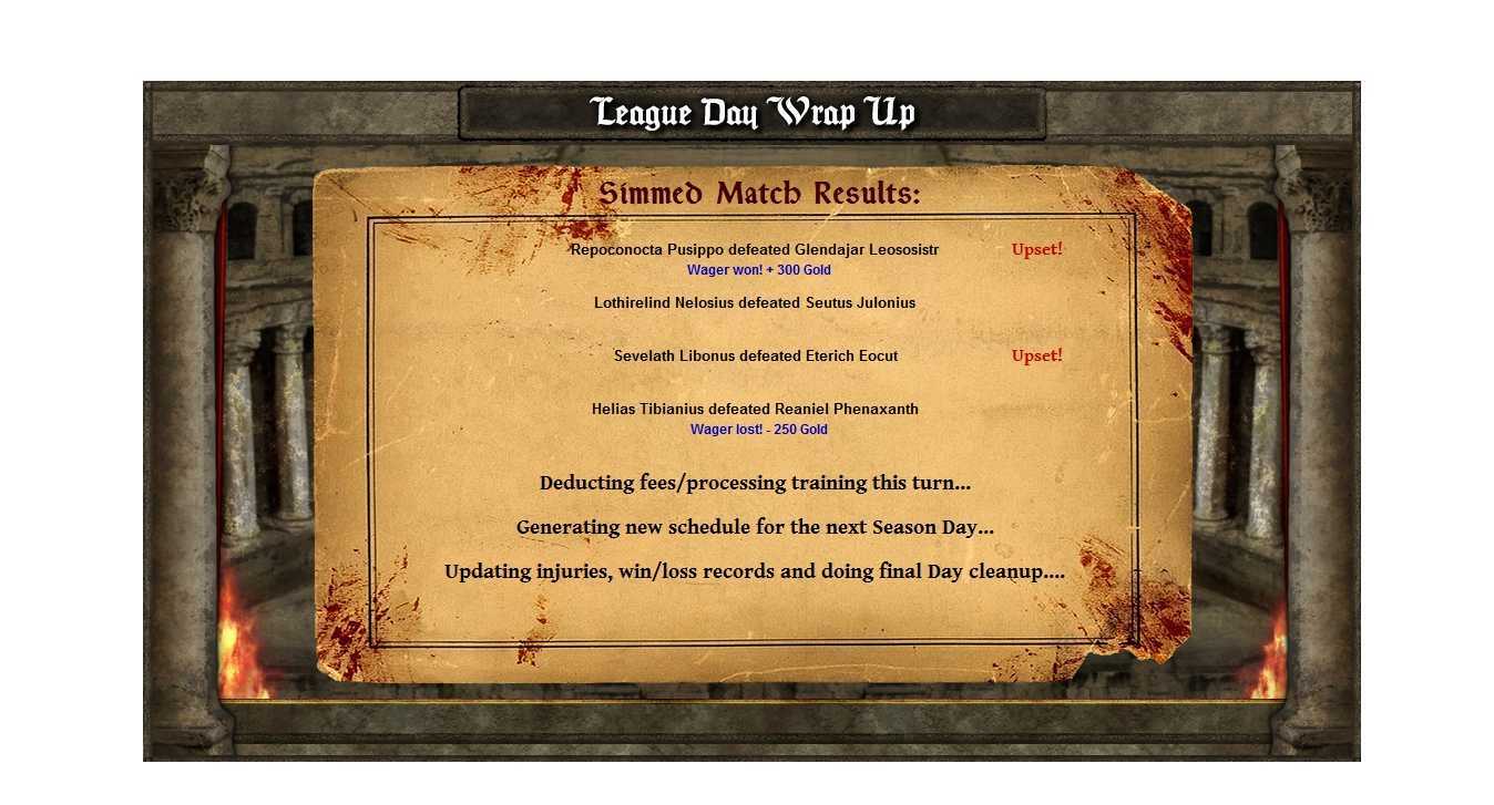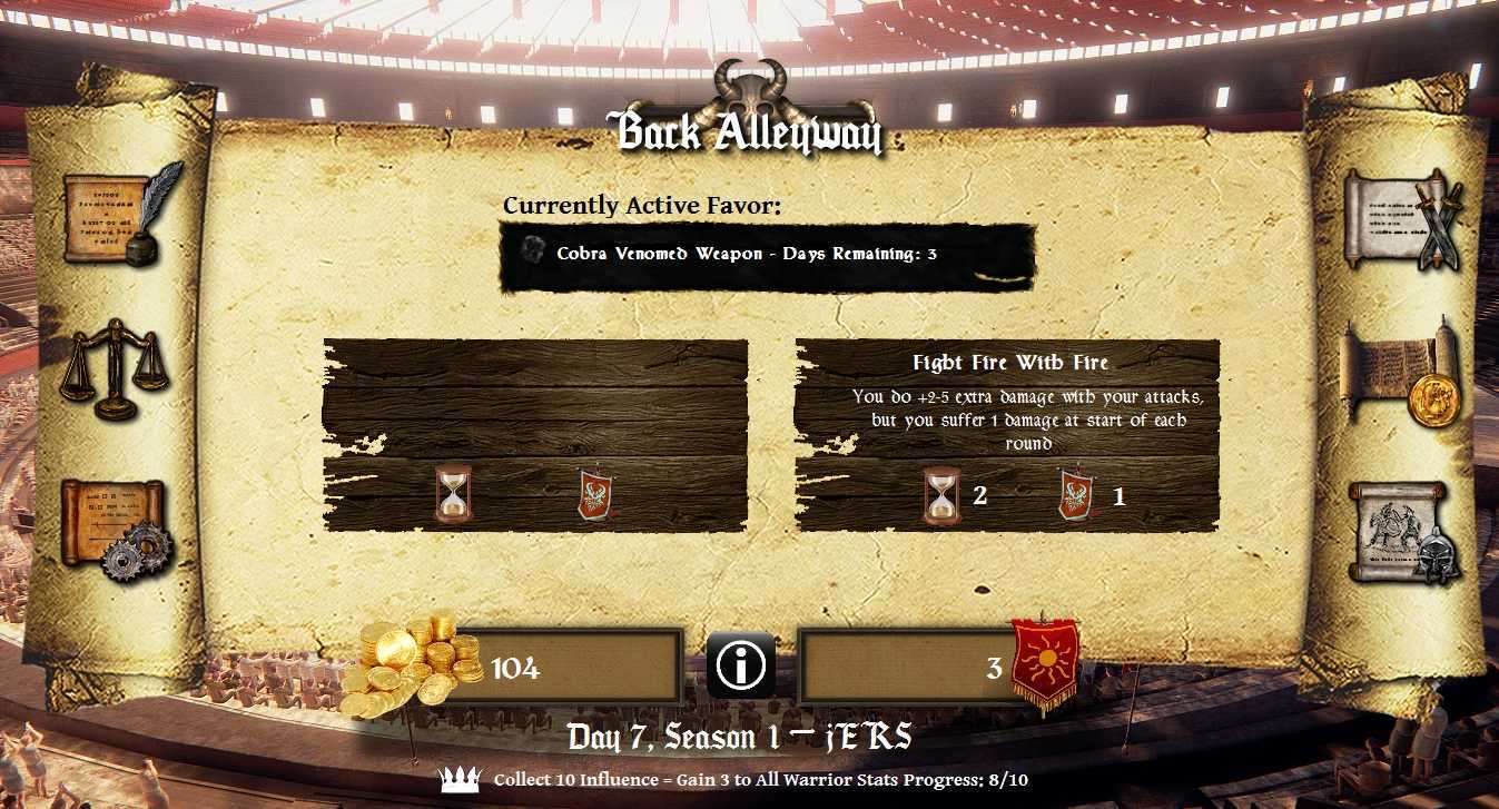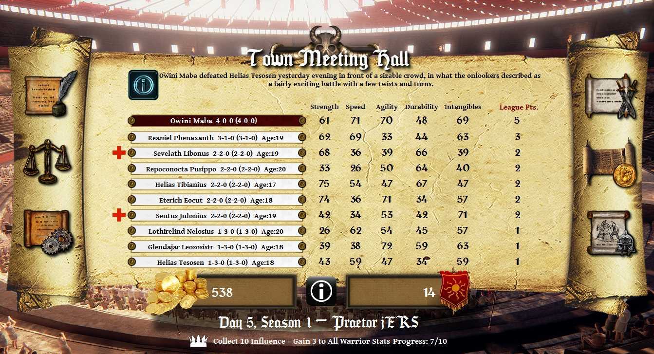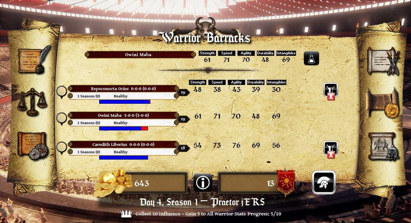 Пока ваш основной боец будет сражаться на арене, зарабатывая вам славу и золото, а себе очки в таблице, другие ваши гладиаторы могут тренировать свои характеристики или отправиться на выполнение квеста. В каждом сезоне квесты разные, но их всегда три – они отличаются по длительности выполнения и награде соответственно. Также есть риск, что ваш боец не вернется с квеста или вернется с травмой – так что имейте ввиду. В игре также есть возможность апгрейдить лудус, арену, нанимать новых бойцов, подкупать противника, делать ставки на бои, вкладывать деньги в раскрутку своего лудуса и конкретных боев и т.д. Не лишена игра и фатальных случайных (и не очень) событий. Например, один из моих бойцов лишился половины стойкости просто потому, что я перестарался с зельями для улучшения характеристик.