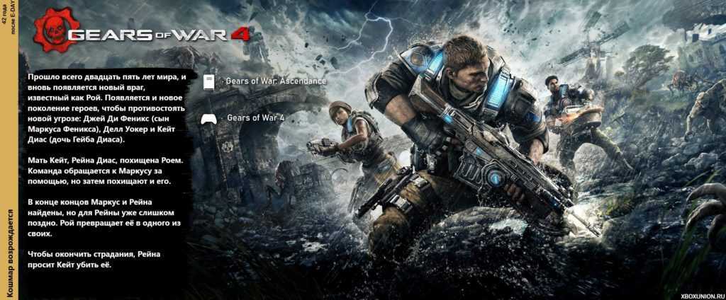 Не считая ремастера первой части Gears of War Ultimate Edition. Четвёртая шестерня отнюдь не стала пятым колесом в телеге. Новая студия The Coalition, в чьи умелые руки перешла франшиза, вполне органично смогла продолжить основную игровую серию. Пускай, возможно, в несколько привычном ключе. Swarm или Рой, по сути, всё же не сильно отличается от Саранчи. Хотя в пятой части разработчики смогли логично связать воедино весь сериал.