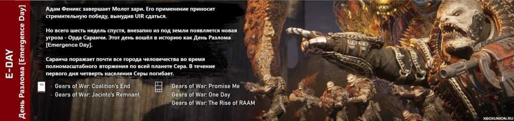 Emergaence Day или День Разлома, ключевая, на данный момент точка в истории вселенной Gears of War. День когда земля разверзлась под ногами и оттуда повалили полчища вооружённых до зубов монстров. Locust или Саранча – это раса человекообразных рептилоидов. Частично об их происхождении мы сможем узнать только в Gears 5, несмотря на концепцию «негативного пространства» отдельных игр, сама вселенная, так или иначе, постепенно обрастает собственной историей.