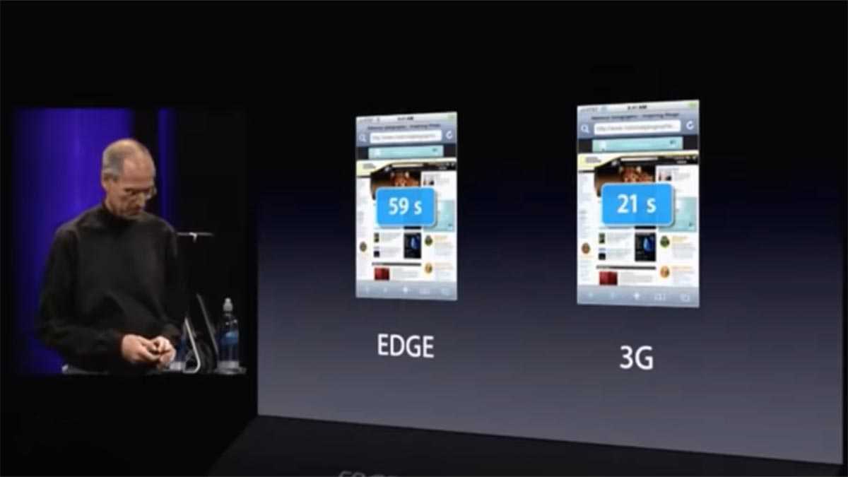 В 2008 году купертиновцы исправились и преподнесли это в качестве классной фишки смартфона. Прямо на презентации показали, как браузер Safari справился с загрузкой стартовой страницы National Geographic за 21 секунду через 3G-подключение, а для 2G сети для этого потребовалось целых 59 секунд.